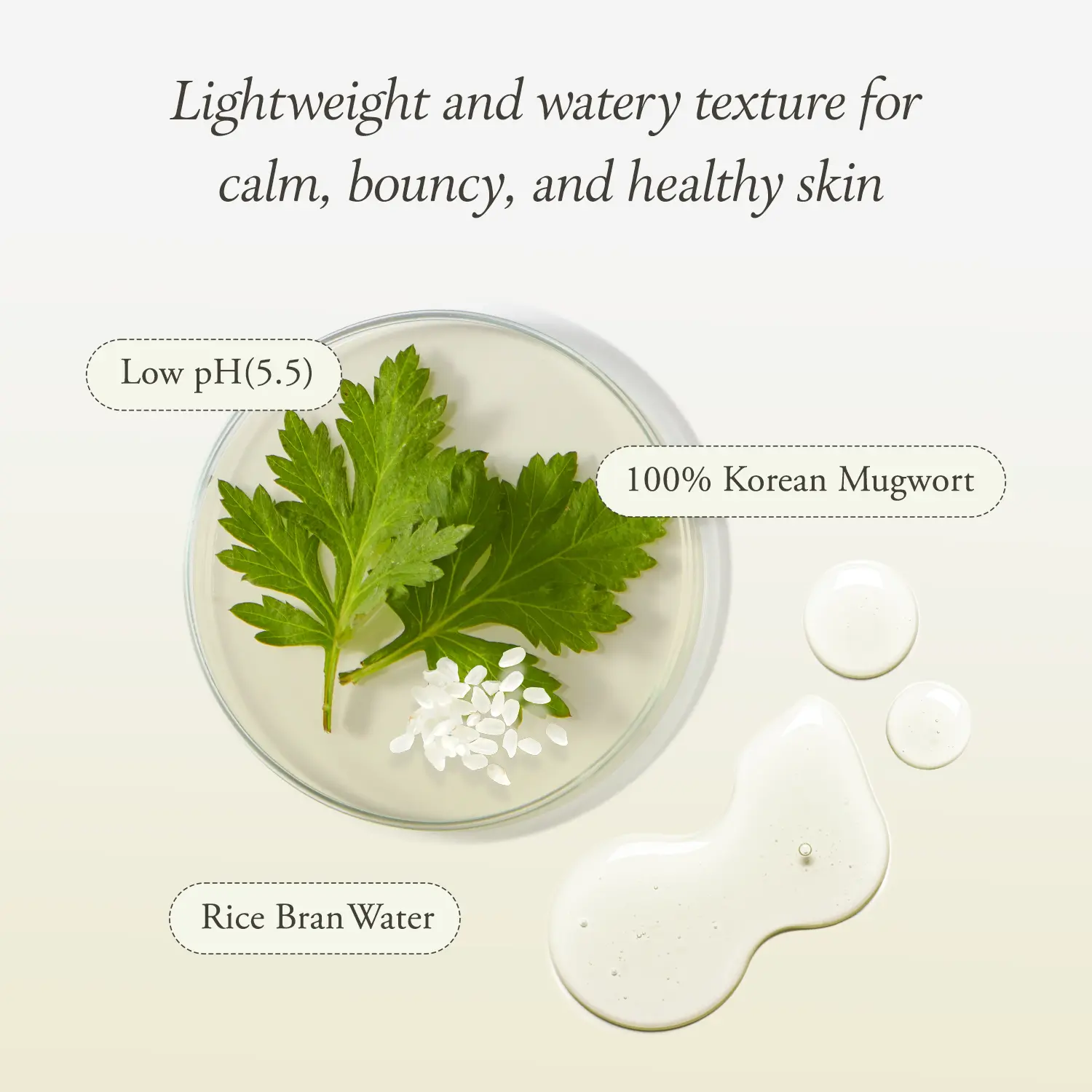 Transform your skincare routine with our Korean Mugwort Hydrating Toner—a low pH (5.5), infused with 80% Artemisia Water, 10,000ppm of rice bran water, and 4 types of hyaluronic acids. This gentle toner deeply hydrates, soothes, and brightens your skin, making it the perfect first step toward achieving a bouncy, glowing complexion. Free from parabens, artificial fragrances, it’s kind to even the most sensitive skin.