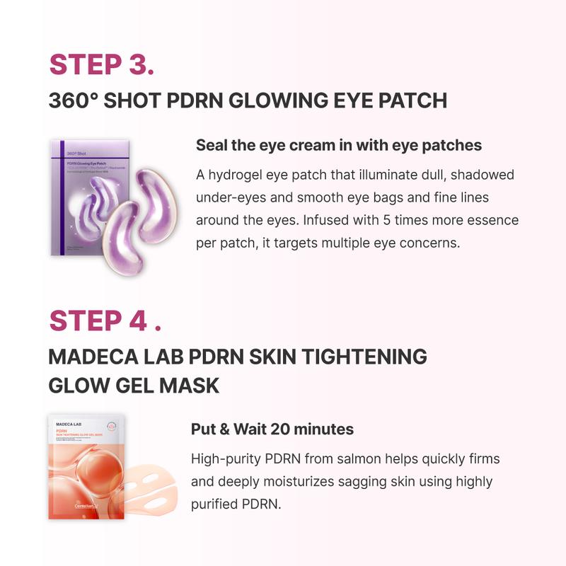 360º Shot PDRN Glowing Eye Patch (6 Pairs) These advanced hydrogel eye patches are designed to help the under-eye area appear brighter, firmer, and smoother. Utilizing a zero-slip hydrogel system to deliver up to 5X essence power, they target the appearance of dark circles, puffiness, and fine lines. Formulated with TECA-2X PDRN Complex, 4th-Gen Retinol, and a blend of Niacinamide and Glutathione, these patches support skin elasticity and radiance. Dermatologically tested for skin irritation, they provide a secure fit for targeted care and an instant-looking glow.