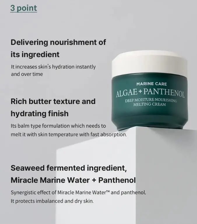 Let your skin indulge in the finest ingredients with our ALGAE + PANTHENOL Marine Care Deep Moisture Nourishing Melting Cream!
