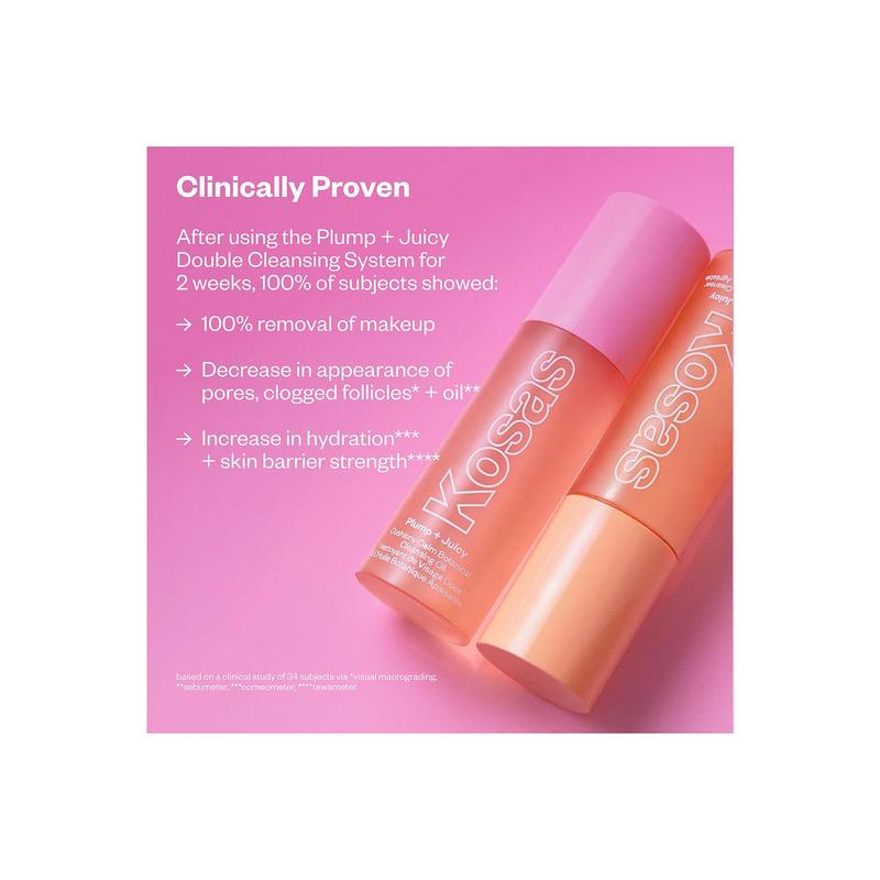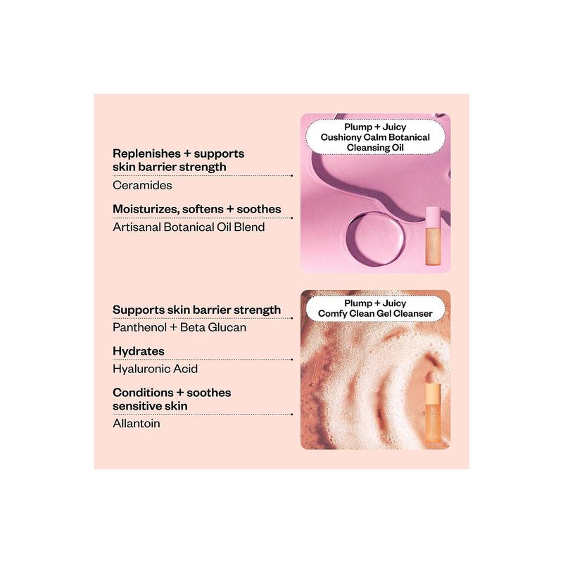 · Includes mini Plump + Juicy Cushiony Calm Botanical Cleansing Oil and mini Plump + Juicy Comfy Clean Gel Cleanser.