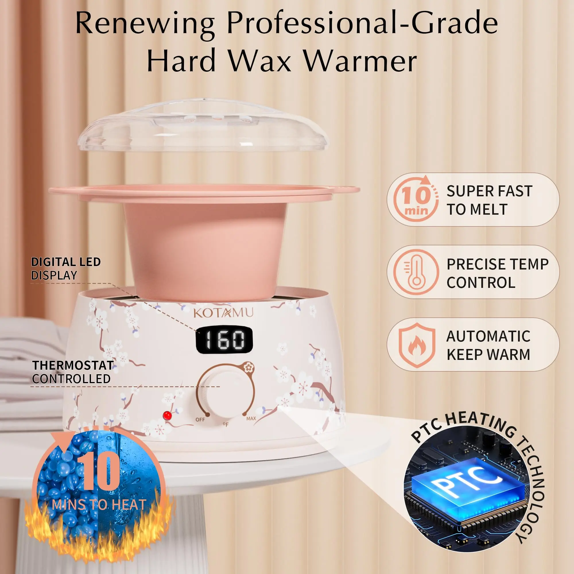 ·10 MINUTES TO HEAT - Uneven melting leads to brittle wax? Not anymore! KOTAMU wax machine features innovative PTC technology and an "Automatic Keep Warm" function, ensuring your wax beans always stays ready for serving! No wait, just smooth application