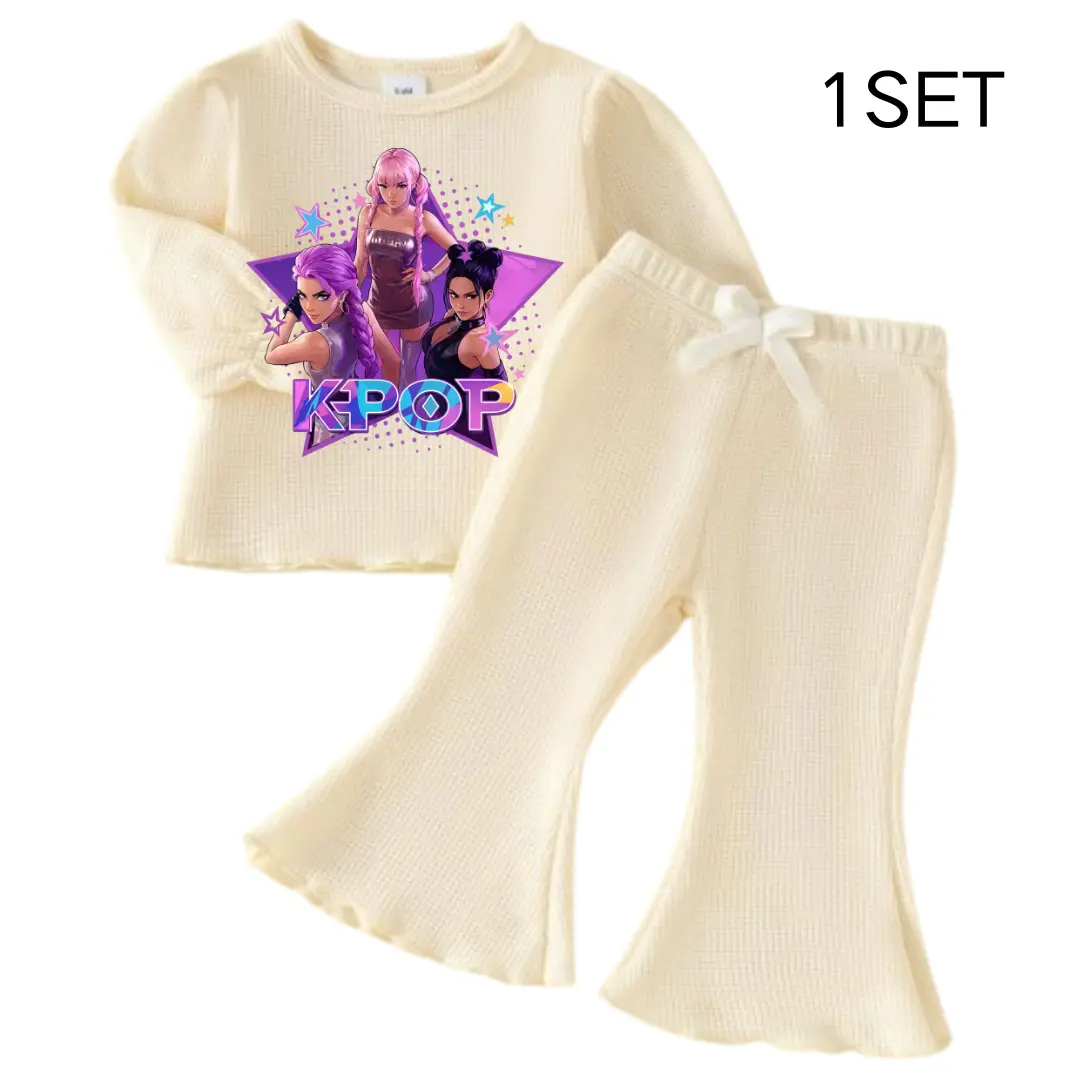 The outfit features a fun cartoon graphic print inspired by the Demon Hunters Tiger movie. It's a playful choice for young fashionistas. The long-sleeved suit ensures warmth and comfort during cooler seasons. Ideal for casual outings, it combines style with practicality.