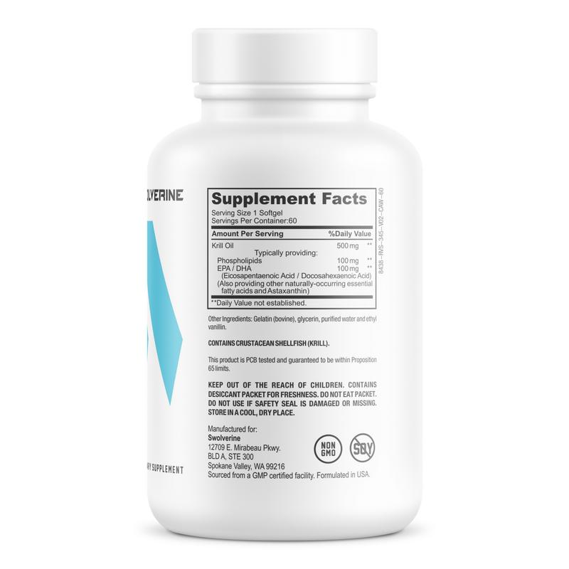 98% of all Americans fall below the general requirement of Omega-3 intake. That's why supplementation is more crucial than ever. Swolverine's Krill Oil supplements contain 500mg of omega-3 essential fatty acids, EPA/DHA, phospholipids, and Astaxanthin. These Krill Oil omega-3 supplements with Astaxanthin are scientifically proven to support your heart, promote brain health, reduce inflammation, improve immune system function, reverse the signs of aging, and improve performance.* With an added hint of vanilla, our Krill Oil supplements are an easy and enjoyable way to optimize how you live.