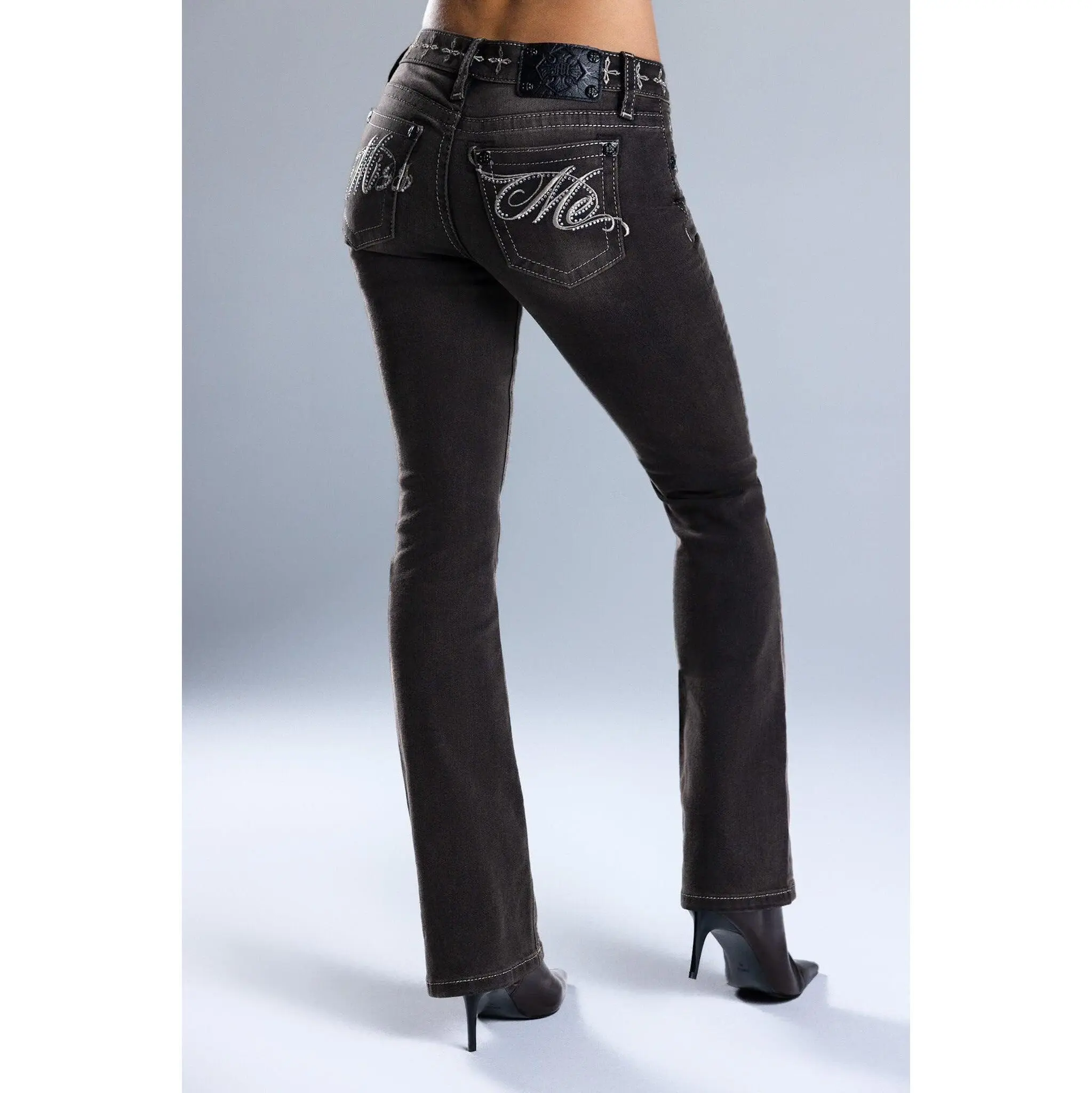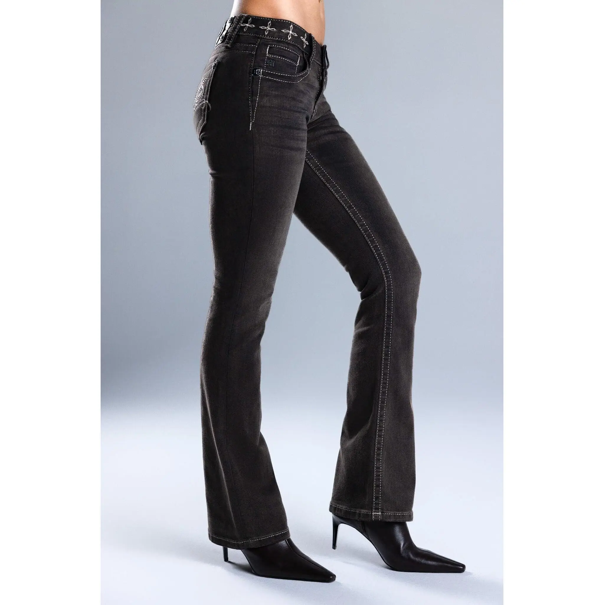 Washed finish, low-rise bootcut jeans infused with a dark Y2K edge. Designed to elongate the legs and enhance your curves, this sculpting silhouette delivers a bold 2000s baddie vibe with subtle gothic detailing.