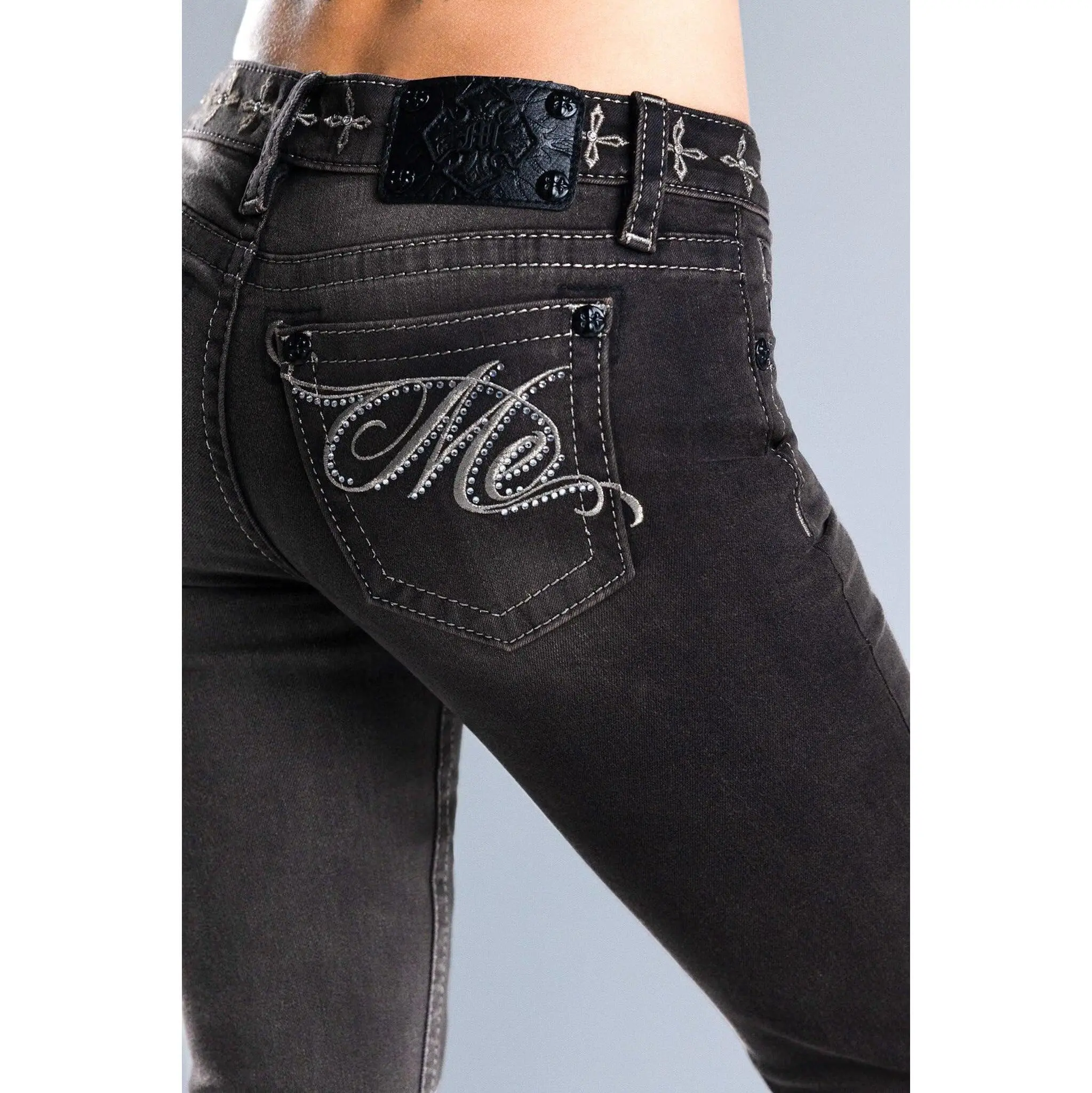 · Embossed black studded leather cross Miss Me brand patch