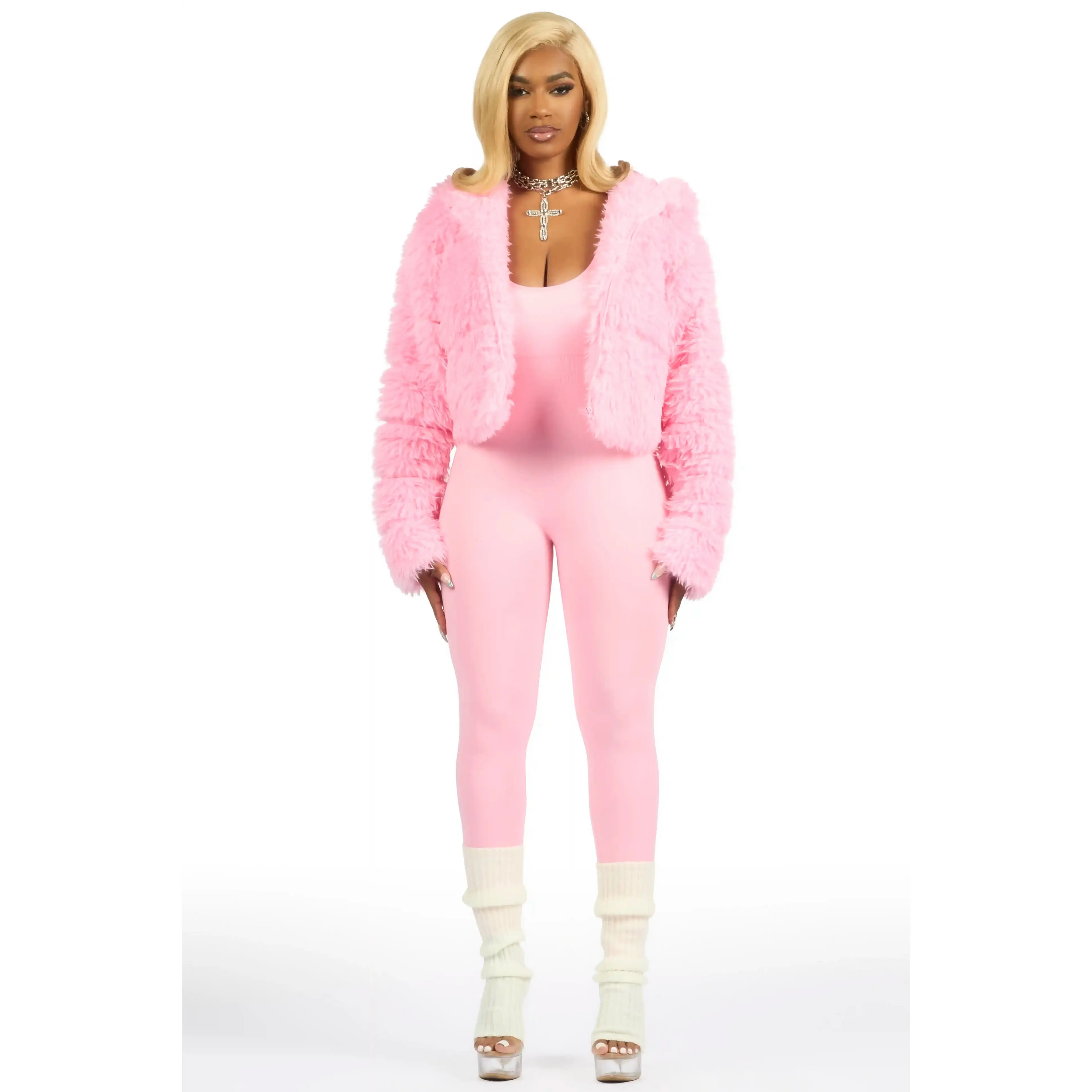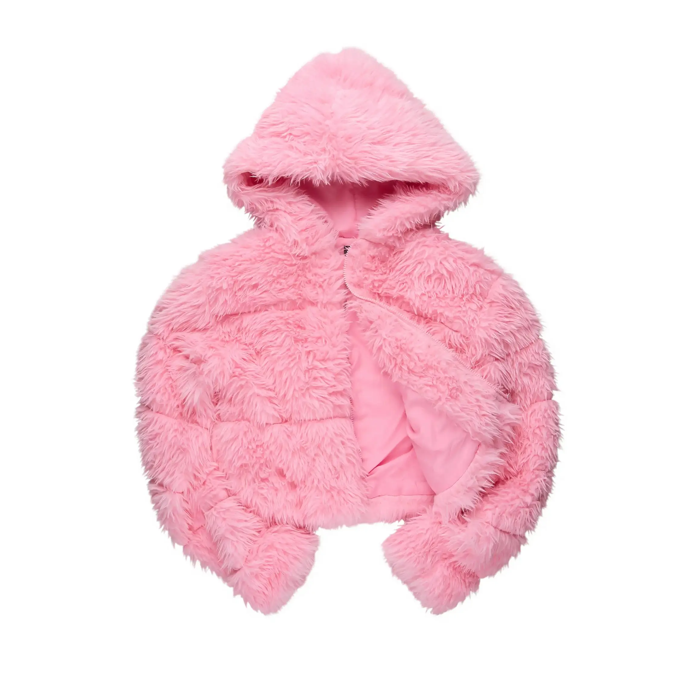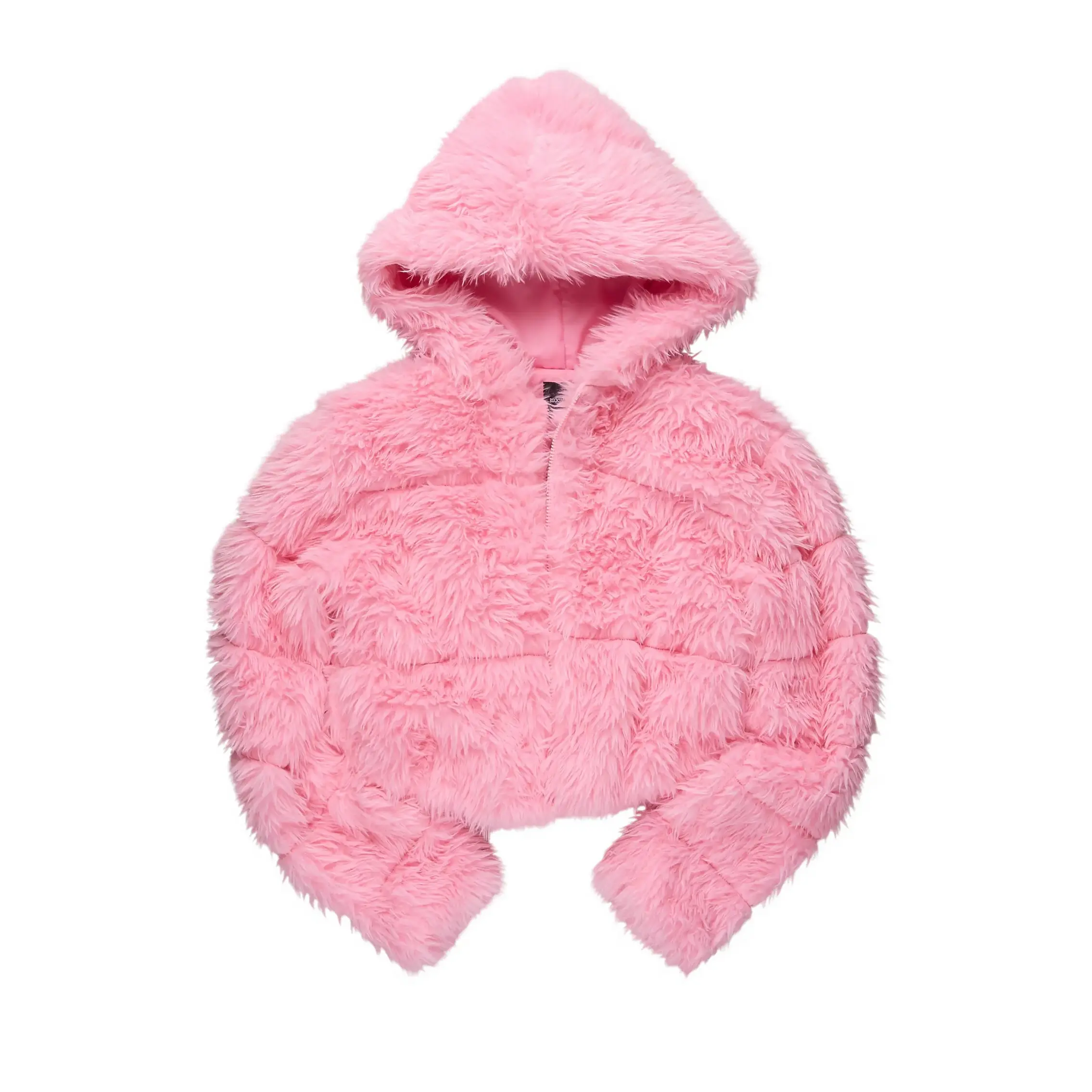 An urban fur jacket for women in baby blue. Designed with an ultra soft faux fur exterior and lightweight interior for optimal warmth.