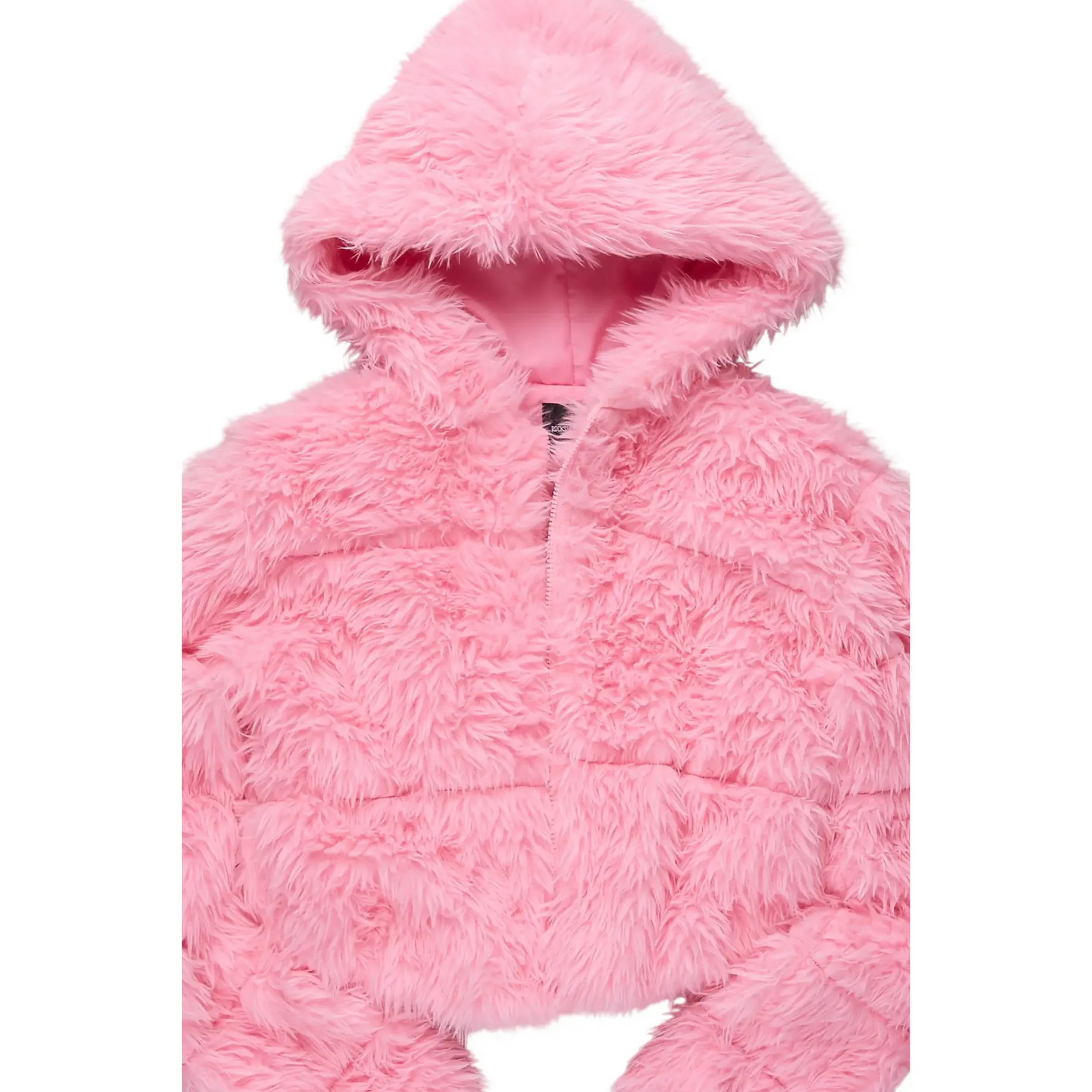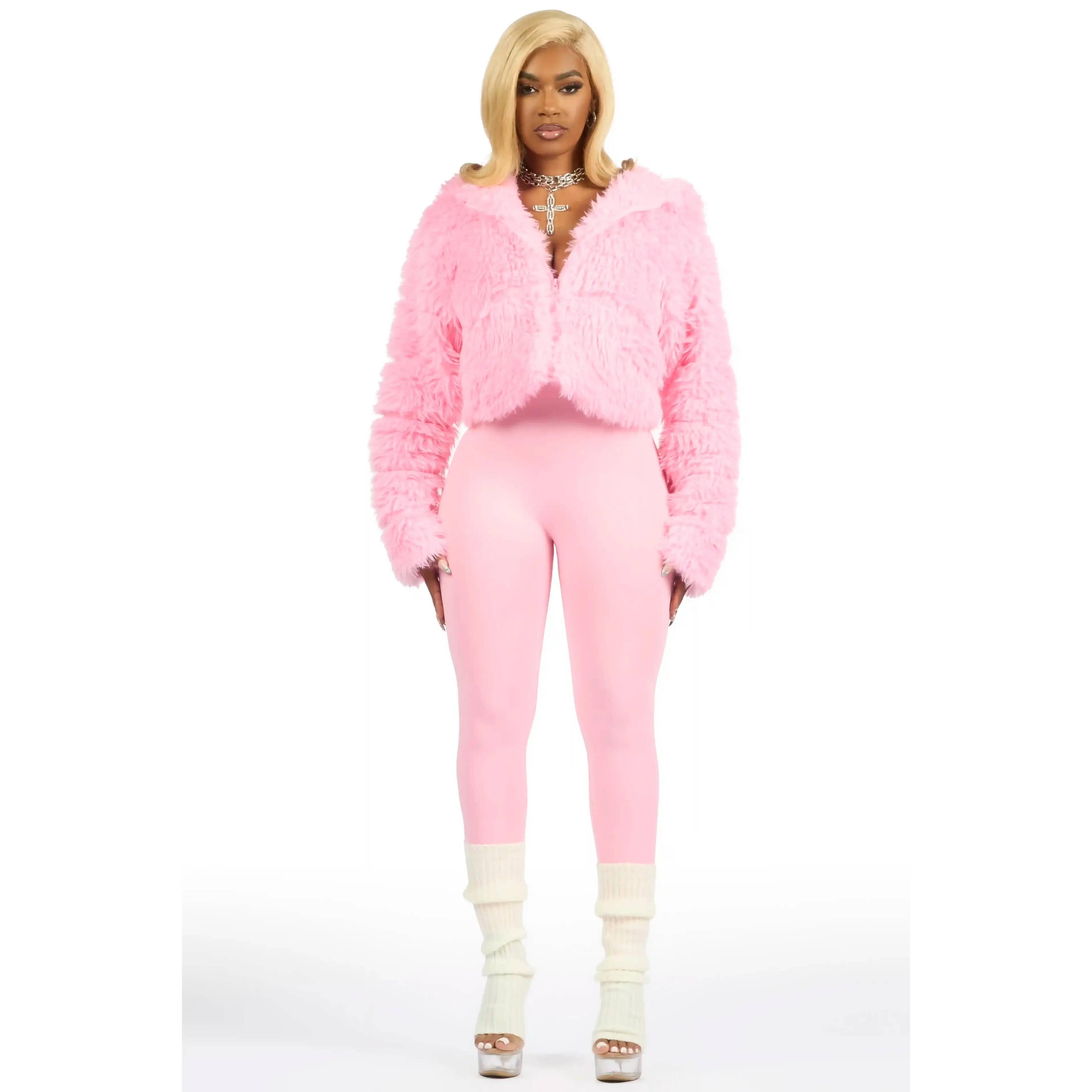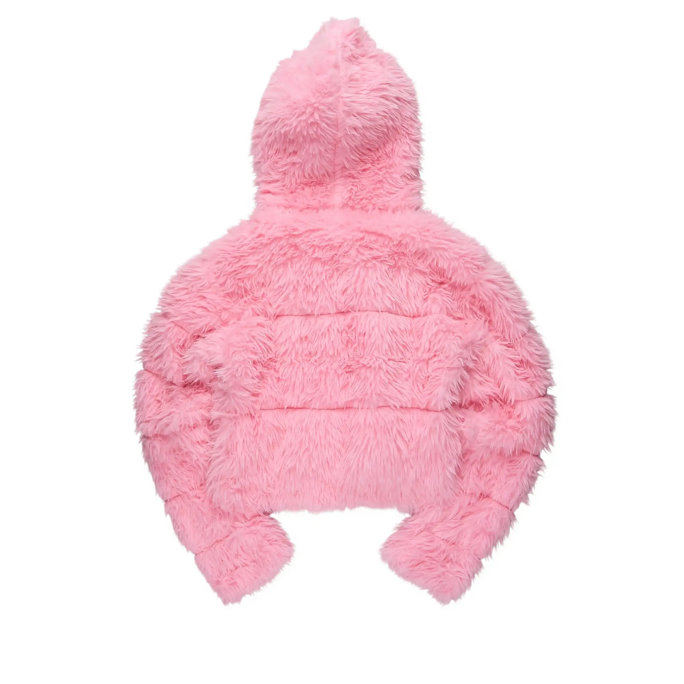 An urban fur jacket for women in baby blue. Designed with an ultra soft faux fur exterior and lightweight interior for optimal warmth.