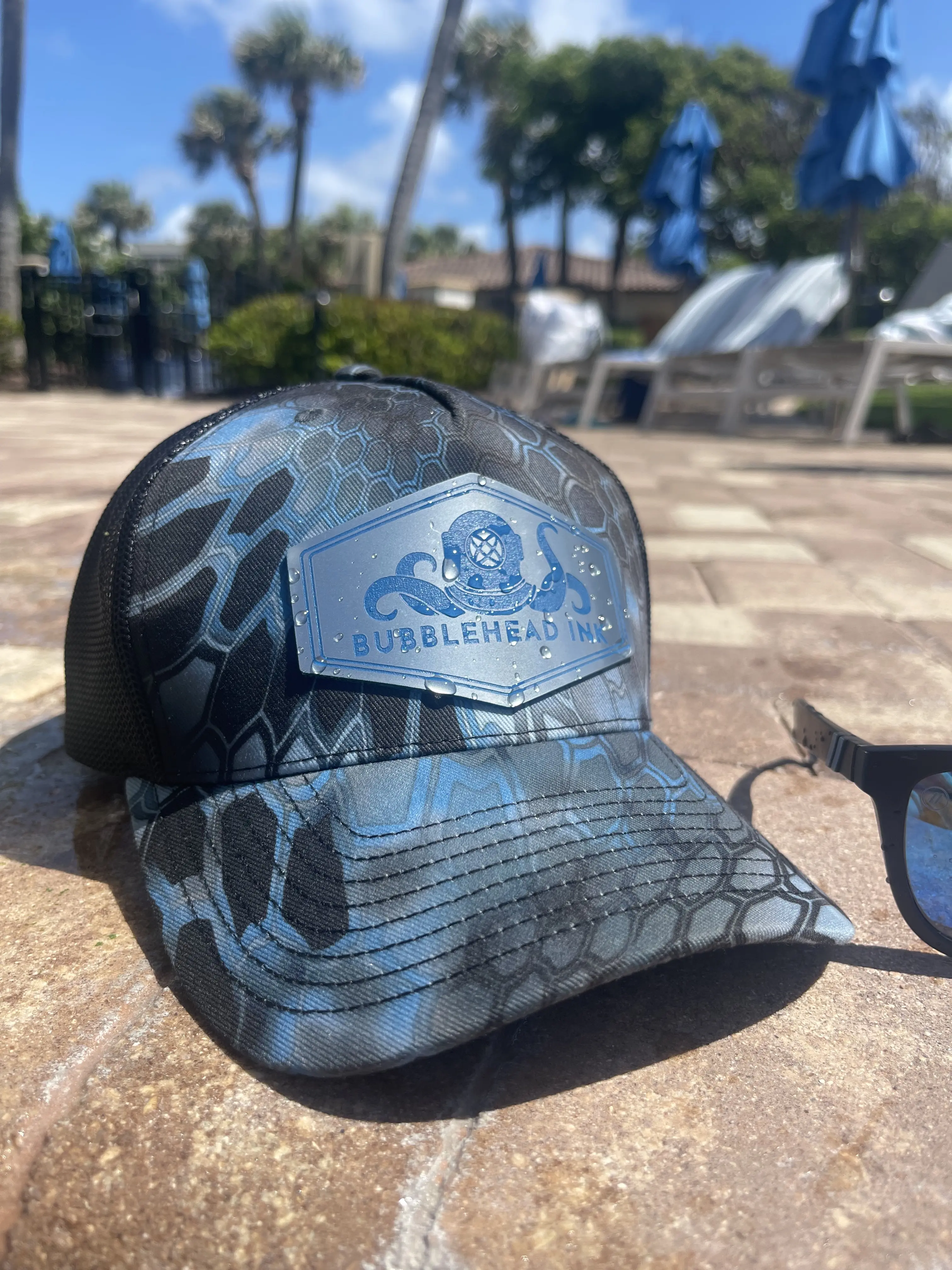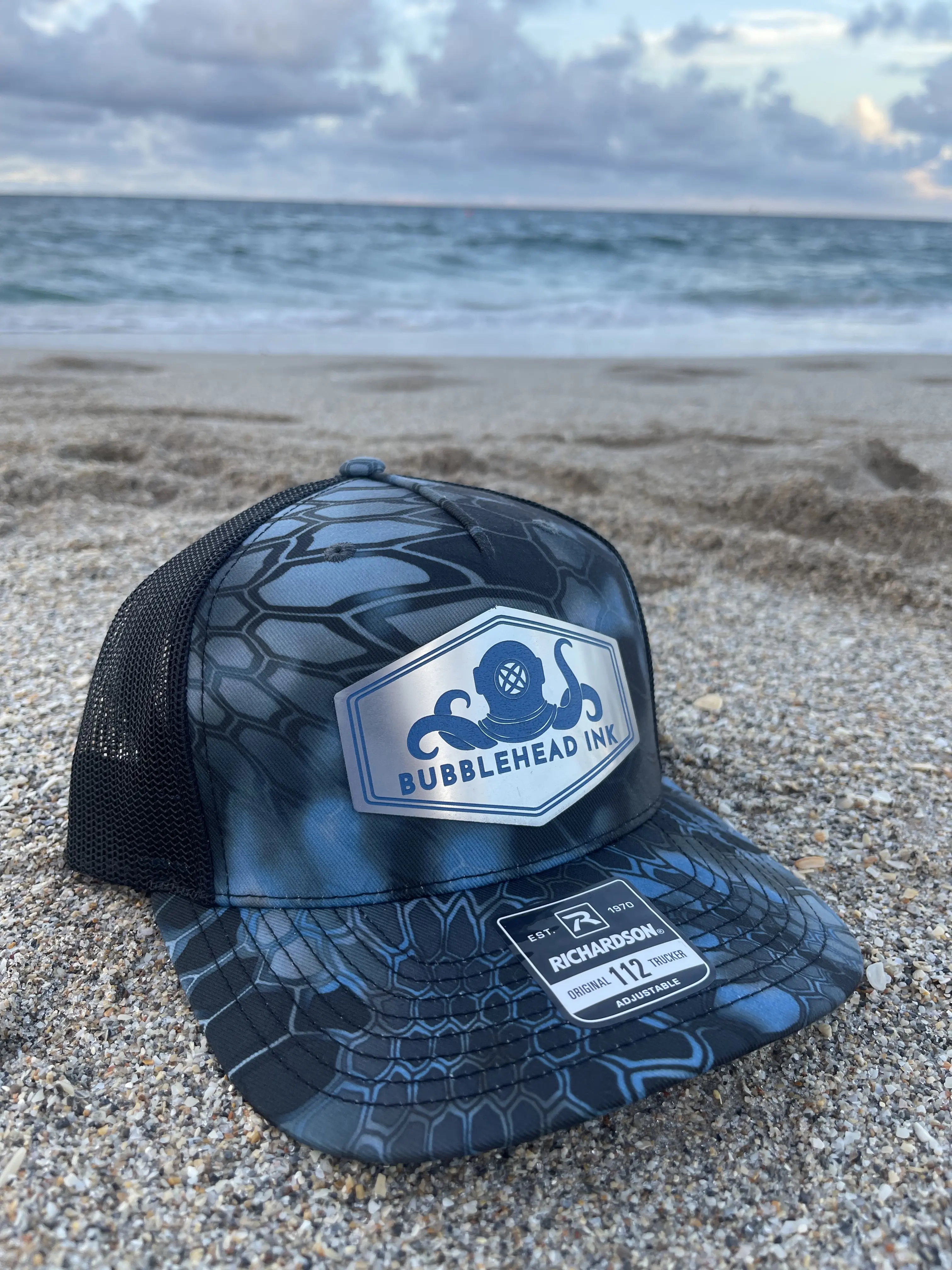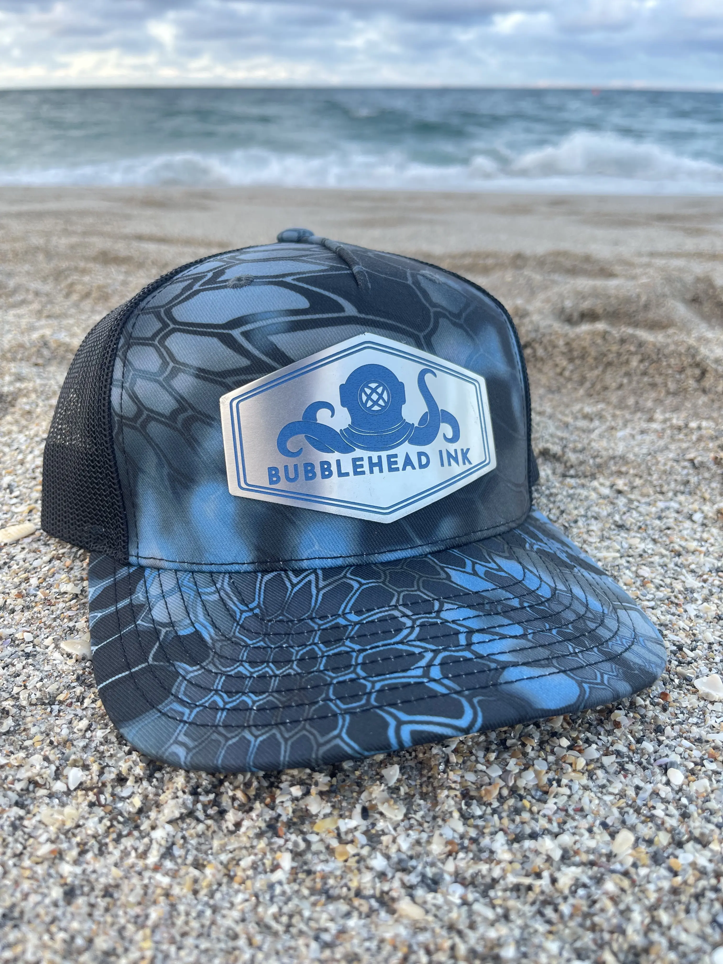 Celebrate your support for the US Navy and honor military veterans with our exclusive Patriotic Submariner Hat by Bubblehead Ink. This unique hat features a detailed silver and blue engraved acrylic patch displaying our iconic logo: an octopus with a diver's helmet and a nuclear symbol, a tribute to our co-founder Cody's service as a nuclear mechanic on submarines.