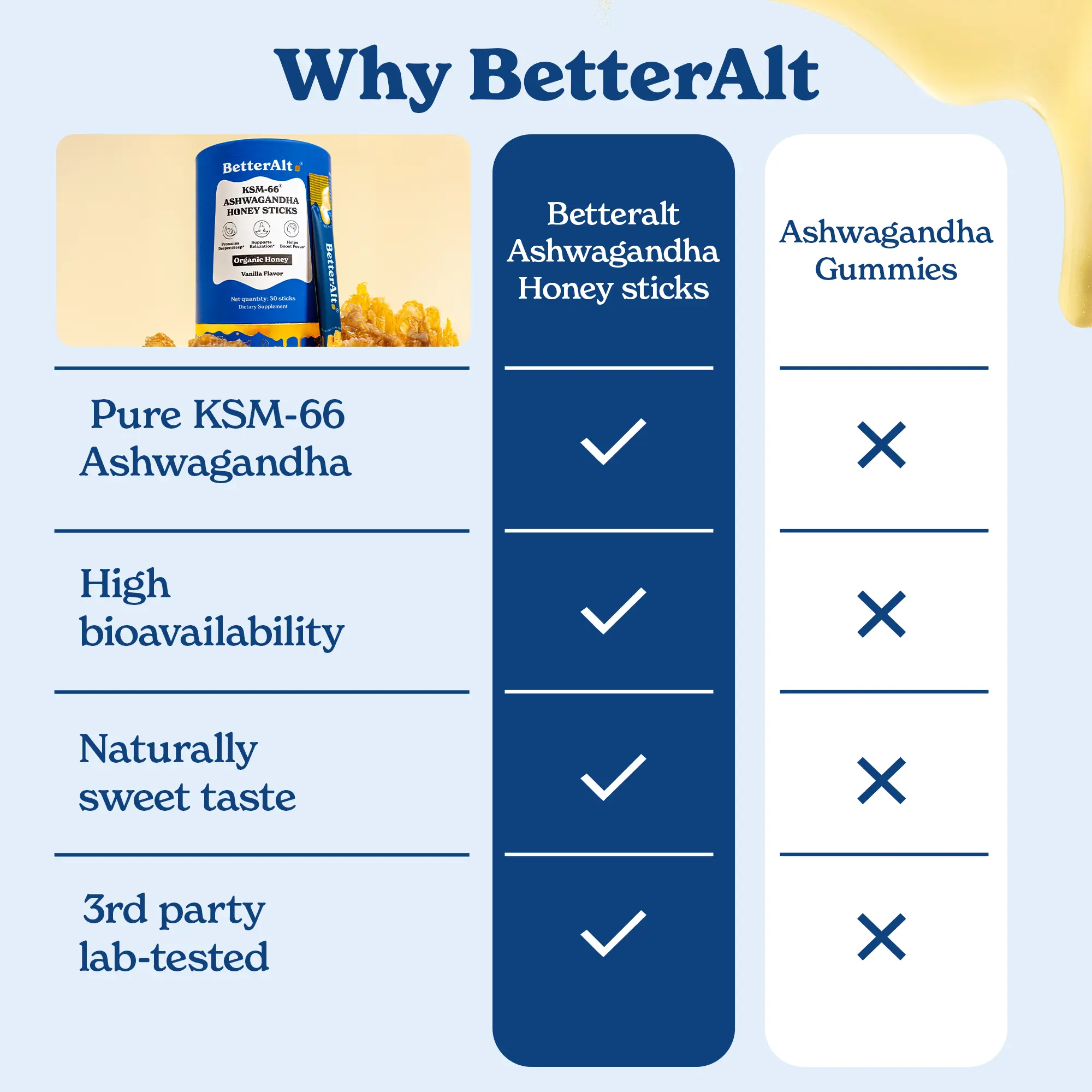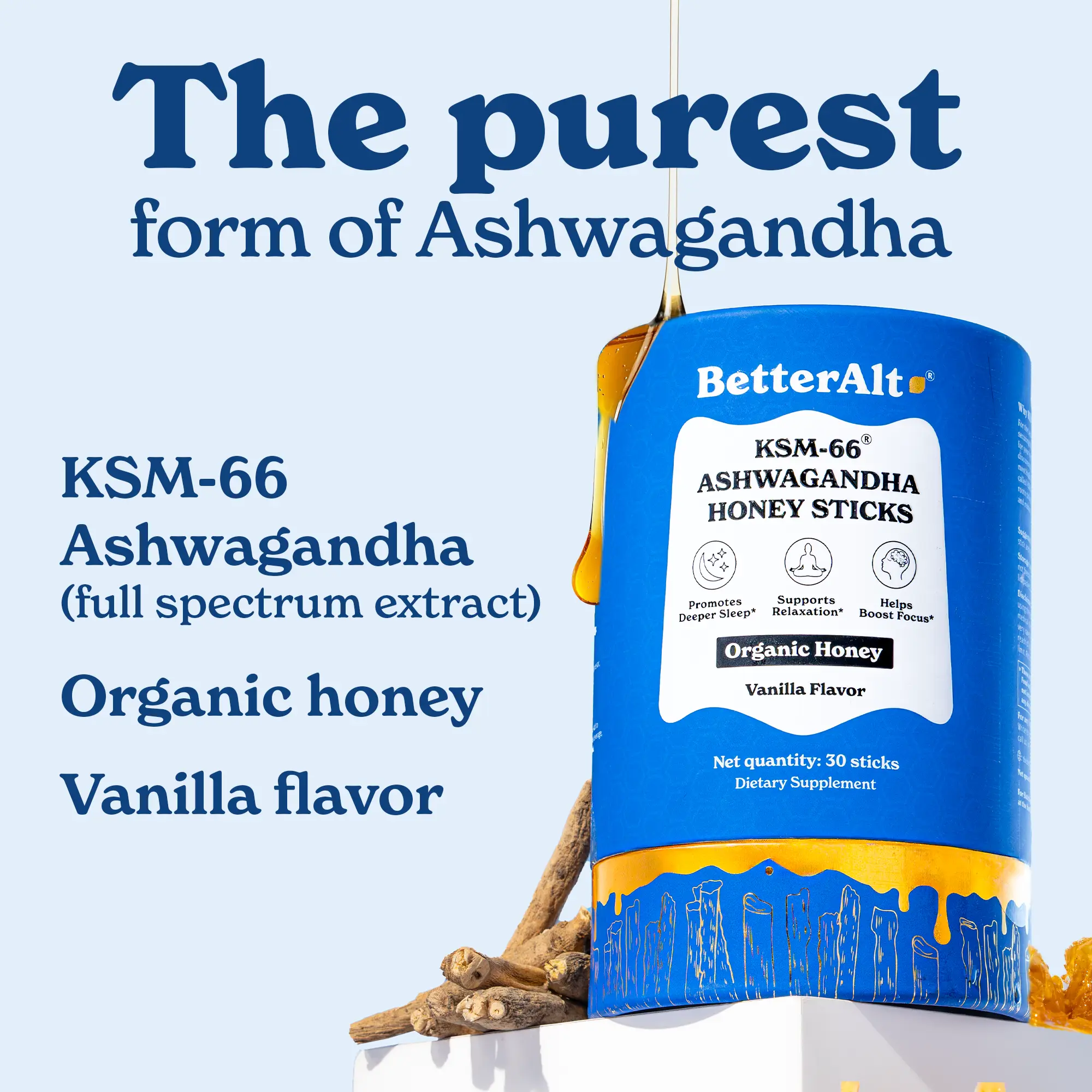 · BetterAlt’s KSM-66 Ashwagandha Honey Sticks are an easy and delicious way to unwind and support your mental and physical well-being.*