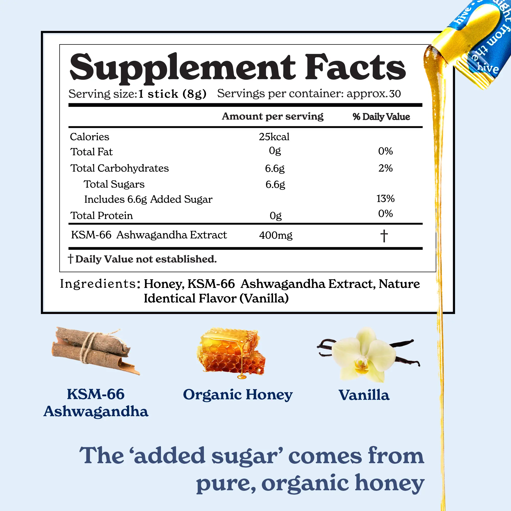 ·These honey sticks combine the power of 400 mg of KSM-66 Ashwagandha with organic Himalayan multiflora honey and a touch of natural vanilla flavor to help promote relaxation, improve focus, and support restful sleep.*