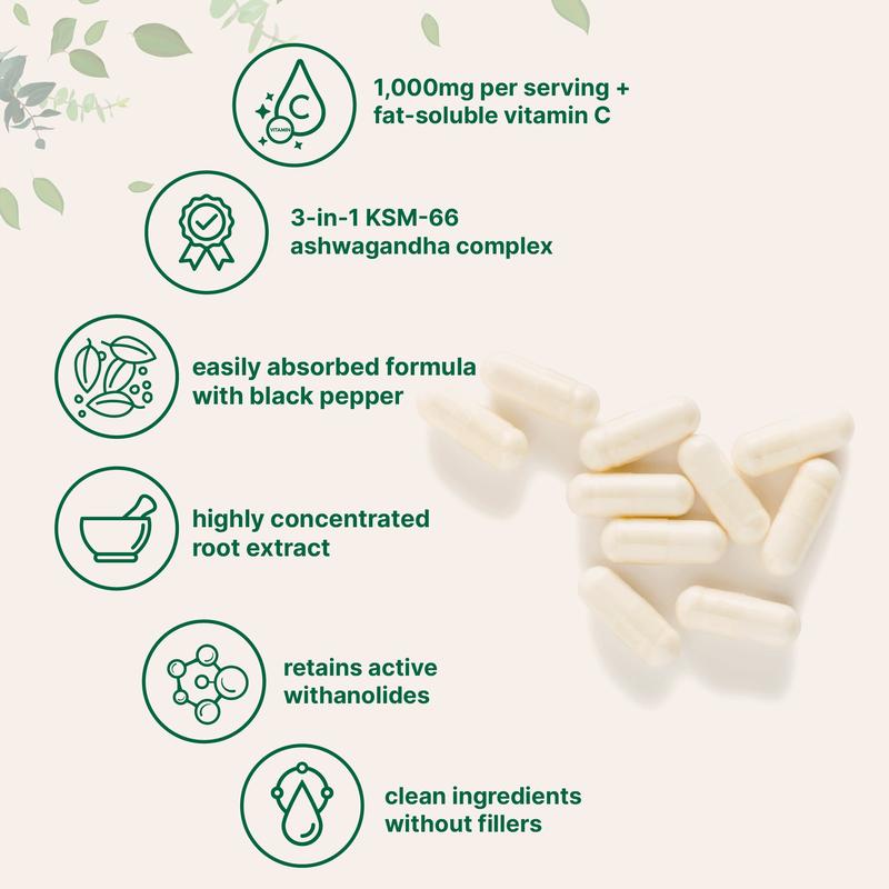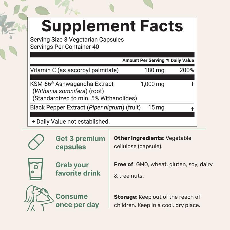 ·Each bottle contains 120 vegetarian capsules with 40 servings. Delivers 1,000mg of pure ashwagandha root extract as Withania Somnifera combined with vitamin C as ascorbyl palmitate and black pepper extract per serving.