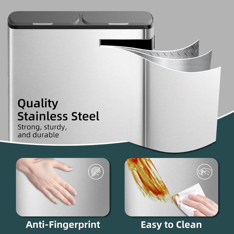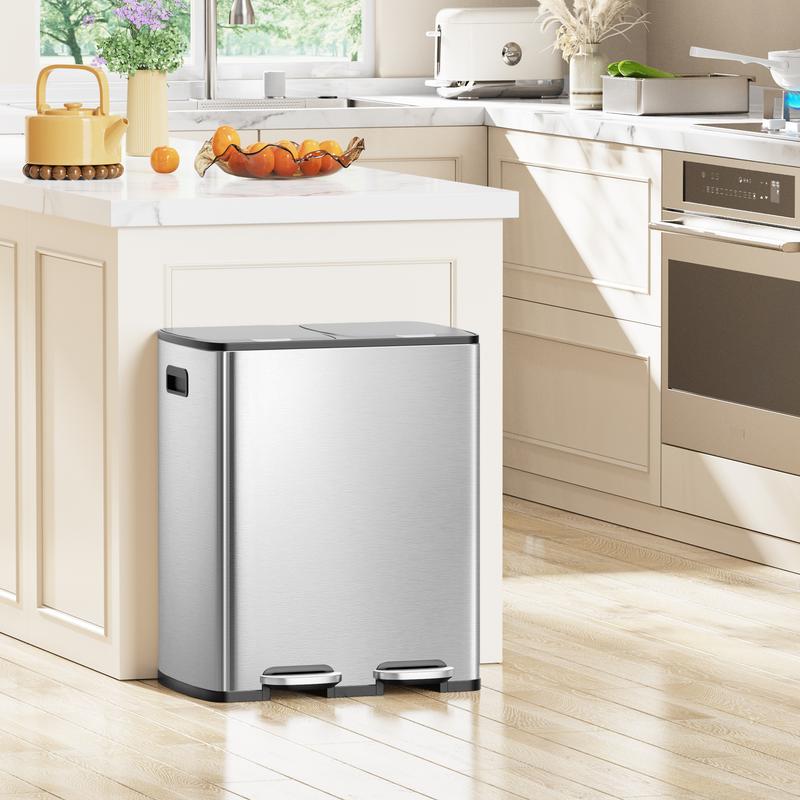 ·With a total capacity of 16 gallons (60L), this trash can has 2 x 8 gallons (30L) compartments, making it easy to separate dry and wet waste.