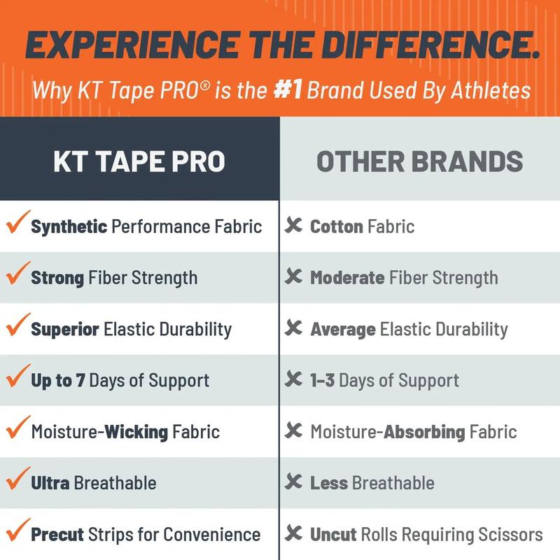 Need support that will endure your toughest workout? KT Tape Pro® is here for you. It has been designed to relieve pain and provide support where you need it, staying in place through multiple workouts. * KT Tape Pro® was created with performance in mind, to work in the harshest environments. It is the world's first 100% synthetic kinesiology tape, re-engineered with stronger adhesive, to outlast anything you can throw at it.