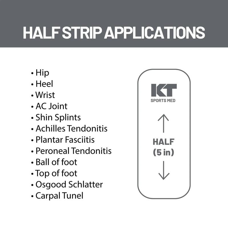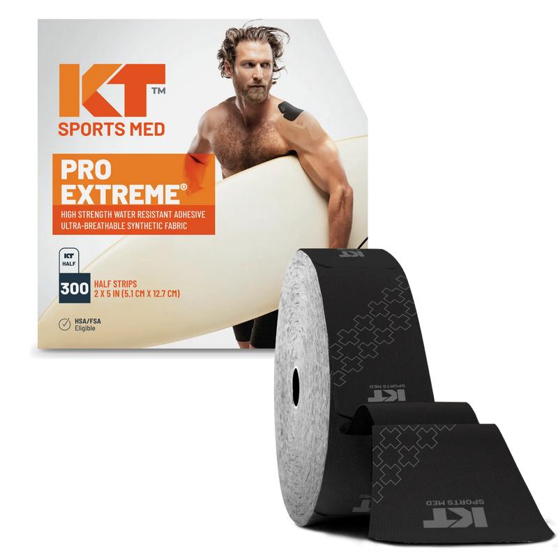KT Tape Pro Extreme® is pre-cut and ready to apply right out of the box. Pre-cut strips have rounded corners which help to prevent the corners from catching on clothing or the edges fraying. Each roll contains 300 pre-cut half-strips that are 5 inches long and 2 inches wide.