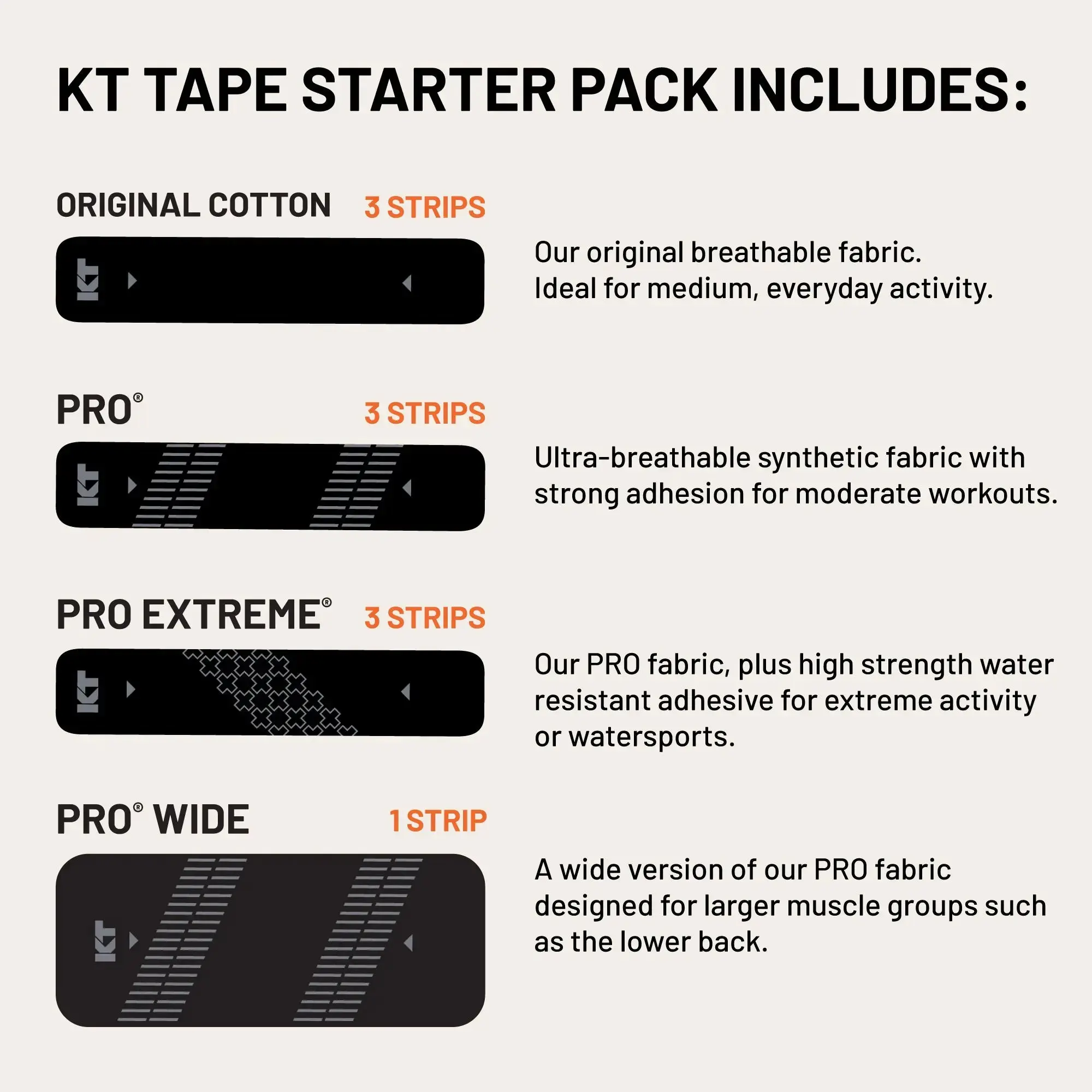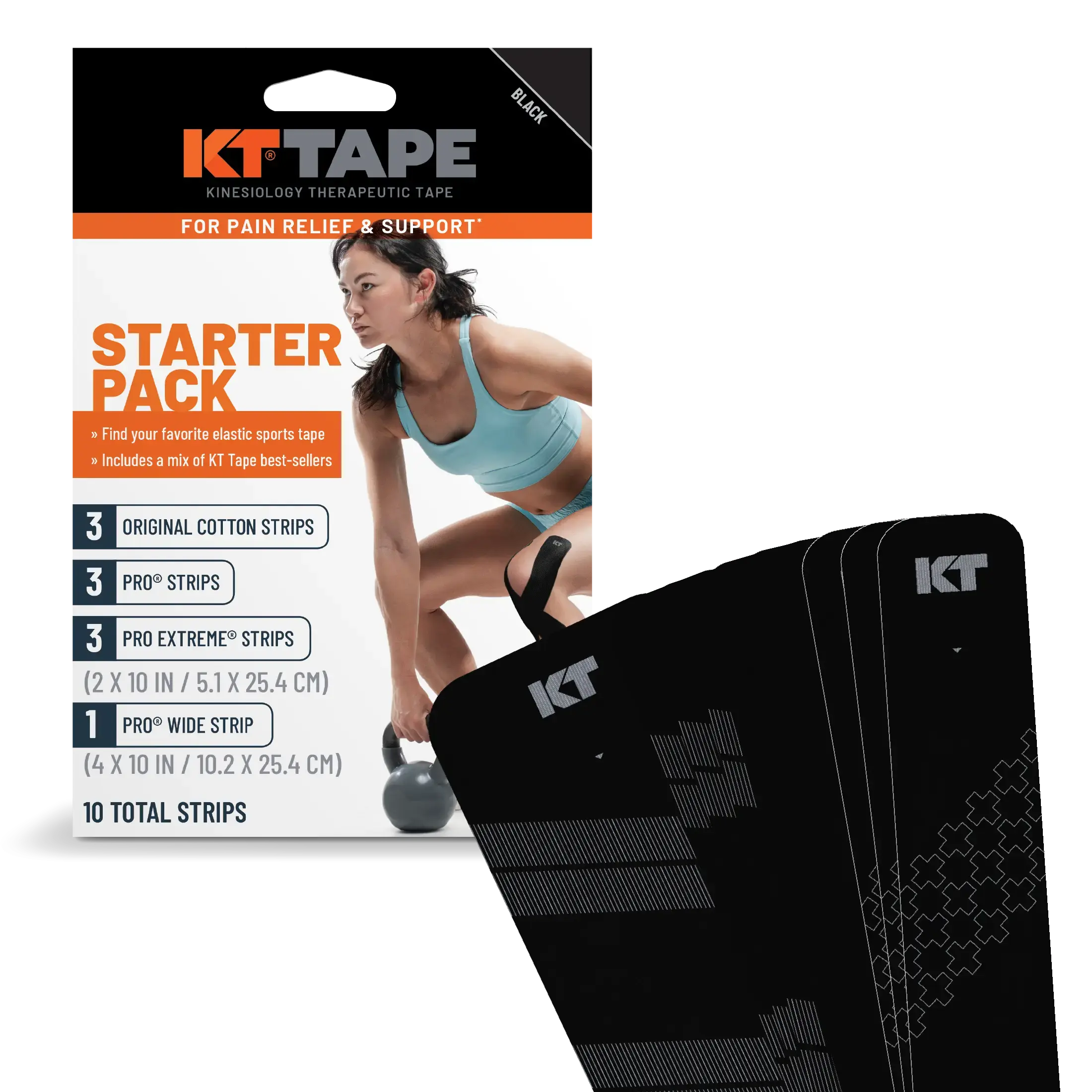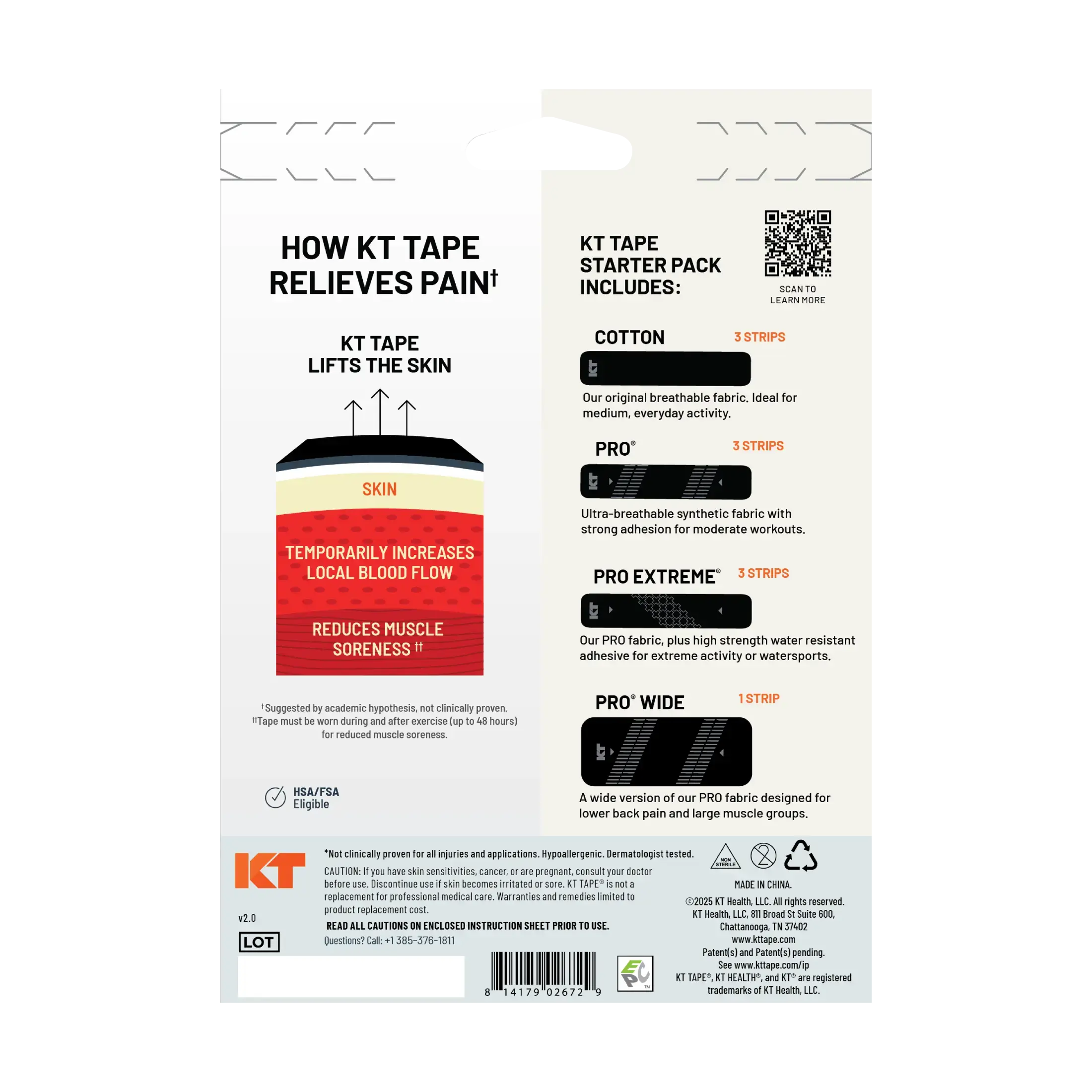 Need support that can endure your workouts and activity, but not sure which KT Tape is right for you? KT Tape® Starter Pack gives you a chance to try multiple types & sizes of KT Tape to find the perfect kinesiology tape for your application. All KT Tape products are designed to relieve pain and provide support, staying in place for multiple days through showers, humidity, cold, and even the pool. This pack gives you the choice of Original Cotton, Pro Synthetic, Pro Extreme, and Pro Wide so you can experience the best of KT Tape’s trusted kinesiology technology.
