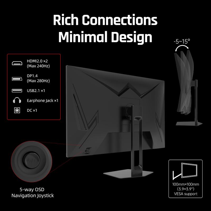 This 280Hz gaming monitor 27 inch has a VESA 100Ć100mm mount, offering the optimum viewing angle and promoting a healthier posture during long gaming sessions. The monitor supports tilt adjustment from -5° to 15° (±2°). You can freely adjust the screen angle according to your sitting posture and usage needs.