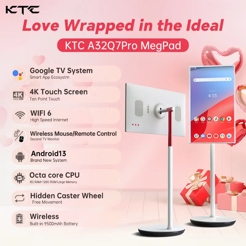 KTC MegPad 32" 4K Touch Screen 3840*2160@60Hz Portable Monitor, Google EDLA-Certified, Support Google TV, Android 13, 8G RAM+128G Storage Octa- core CPU, 3D 20W Speakers, Built-in 9500mAh Battery, WiFi 6 Remote Mouse Control for All Apps, A32Q7Pro