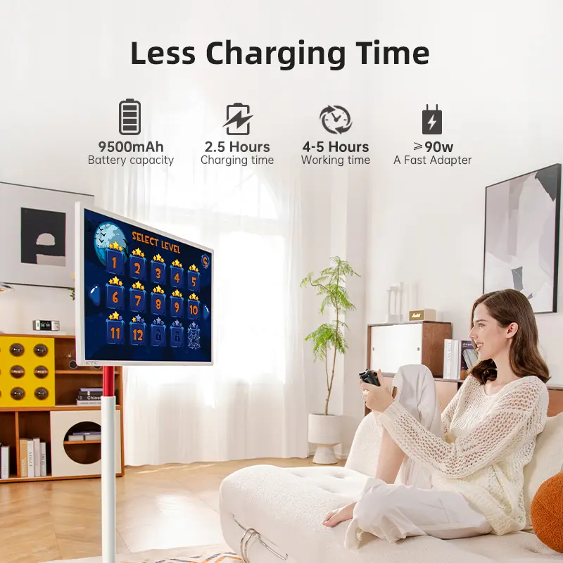 The built-in 9500mAh battery fully charges in just 3 hours, providing up to 11 hours of music playback. Each A32Q7PRO Portable Monitor on wheels comes with a mouse remote control, compatible with all apps, making it easy to use and control your device.