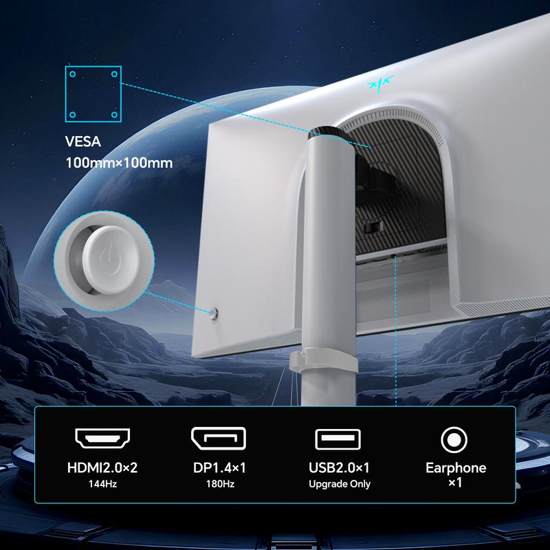 ·Audio/Video Interfaces:2×HDMI2.0@144Hz, 1×DP1.4@180Hz, 1×USB2.0, 1×Earphone out