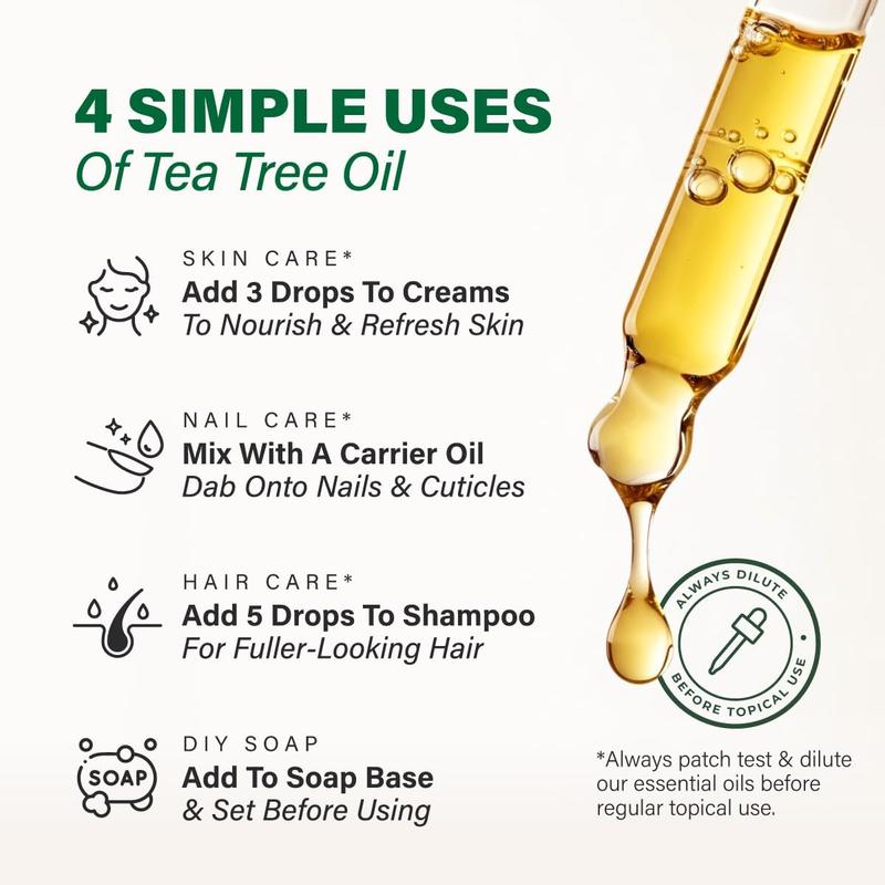 ·Potent and sourced from Australian forests, our Tea tree oil for scalp undergoes rigorous testing for quality & efficacy. For topical use, dilute your oil with carrier oil before using on skin or nails. Perform a patch test before use.
