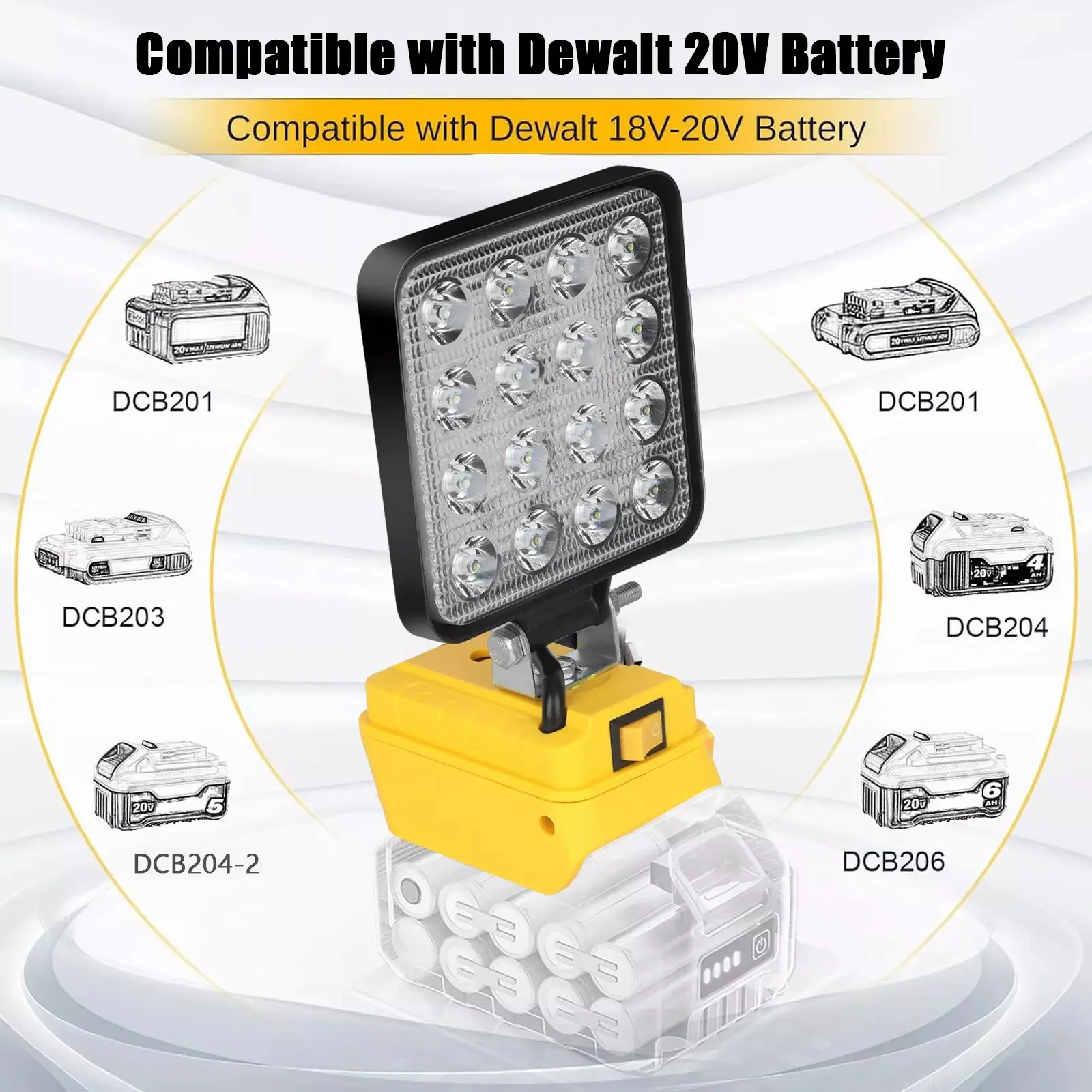 This cordless LED work light is compatible with DeWalt 20V lithium-ion batteries, including DCB206, DCB204, DCB181, DCB182, DCB200, DCB203, DCB205-2, DCB204-2, DCB206-2, and more. (Battery not included) A great choice for DeWalt users looking to enhance their toolkits with a reliable, portable lighting solution.