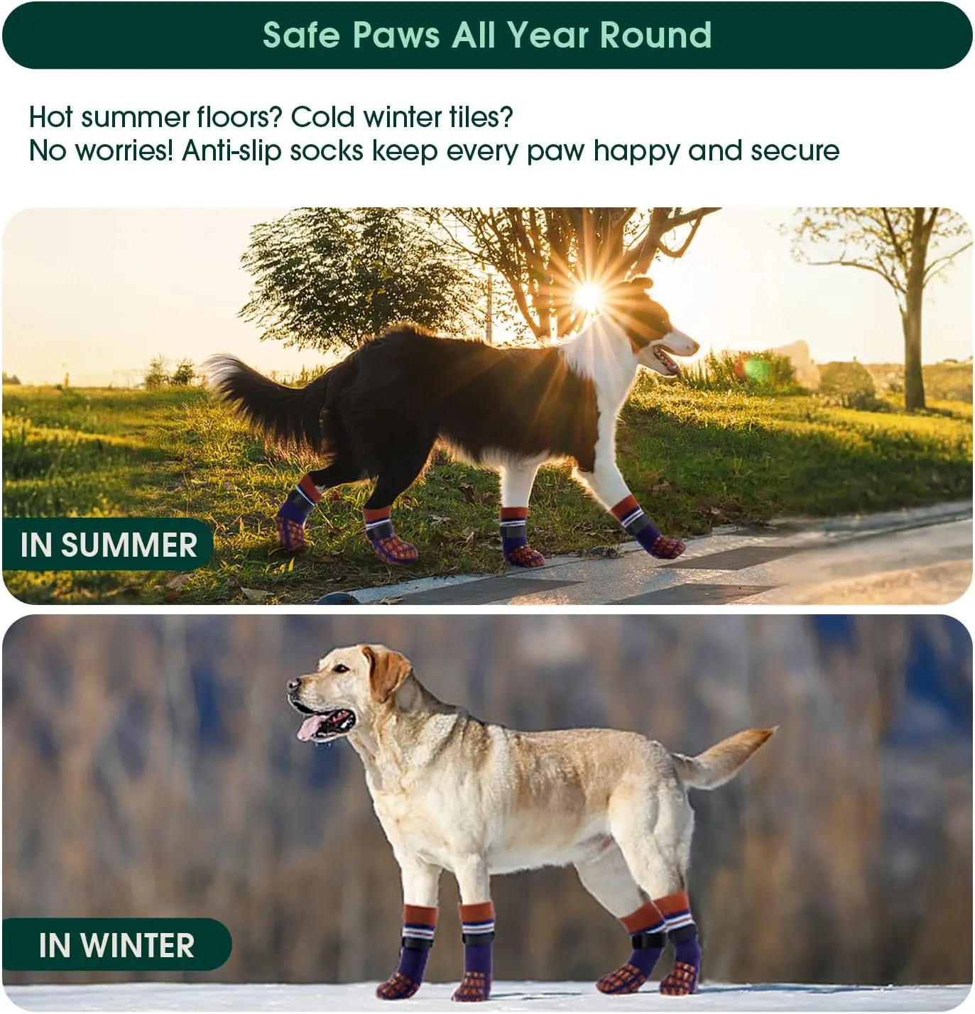 ·All-Weather Paw Protection: Made with durable, breathable material, these dog socks for hot pavement also insulate against cold floors in winter, keeping your pet comfortable year-round. A great alternative to dog booties for hot pavement or dog shoes for snow and ice