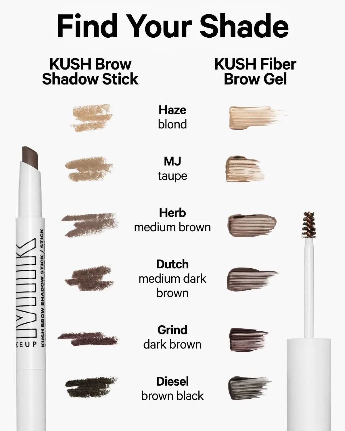 KUSH Brow Shadow Stick What it Is A buildable, highly pigmented cream-to-powder brow stick that instantly fills for soft, full brows that stay smudge-proof up to 12 hours. No extra tools necessary. This product is clean, vegan, cruelty-free, paraben-free, and fragrance-free. 0.03 OZ / 0.9 G How to Use -Lightly swipe the angled tip over brows and build to your desired look. (A little goes a long way!) -Let color sit for 10 seconds, then use the built-in spoolie to diffuse color and brush brows into place. -For extra hold, wear with KUSH Fiber Brow Gel or KUSH Brow Lamination Gel. Ingredients -Vegan waxes create a soft, flexible hold -Hemp seed oil conditions and nourishes for brows that feel soft, never stiff