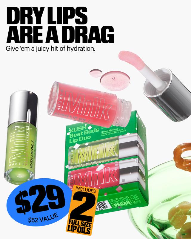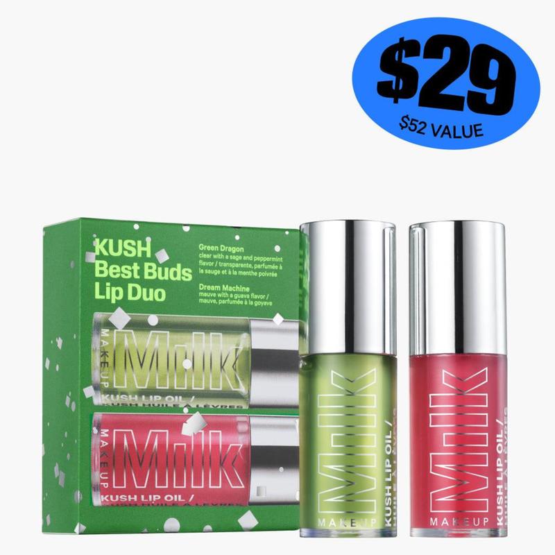 KUSH Best Buds Lip Oil Duo What it Is Dry lips are a drag. Keep 'em soft and smooth with this limited-edition makeup gift set featuring two hydrating lip oils that'll hit up the shine. Includes two full-size KUSH Lip Oils in Green Dragon (clear with a sage and peppermint flavor) and Dream Machine (mauve with a guava flavor). Save 45% when you get 'em together in this set. 5.5 ML / 0.18 FL OZ How To Use Swipe - Wear on bare lips for a sheer lip-enhancing tint. Layer - Wear over Cooling Water Jelly Tint or Lip + Cheek for a hit of shine. Reapply - Apply as often as needed for smooth, hydrated lips.