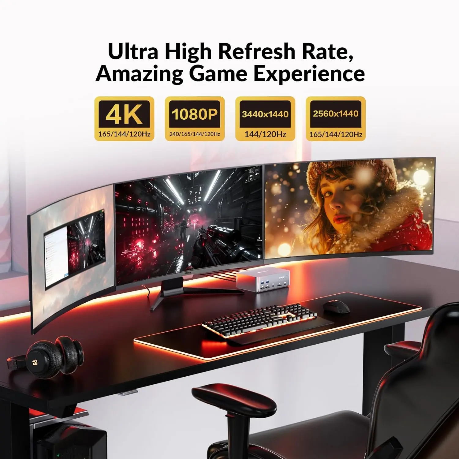 ·Supports 4K@165/144Hz, 3440×1440@165/144/120Hz, 2560×1440@240/165/144Hz, and 1080P@240/165Hz. Ideal for sports, action movies, and high-speed racing games. 📺