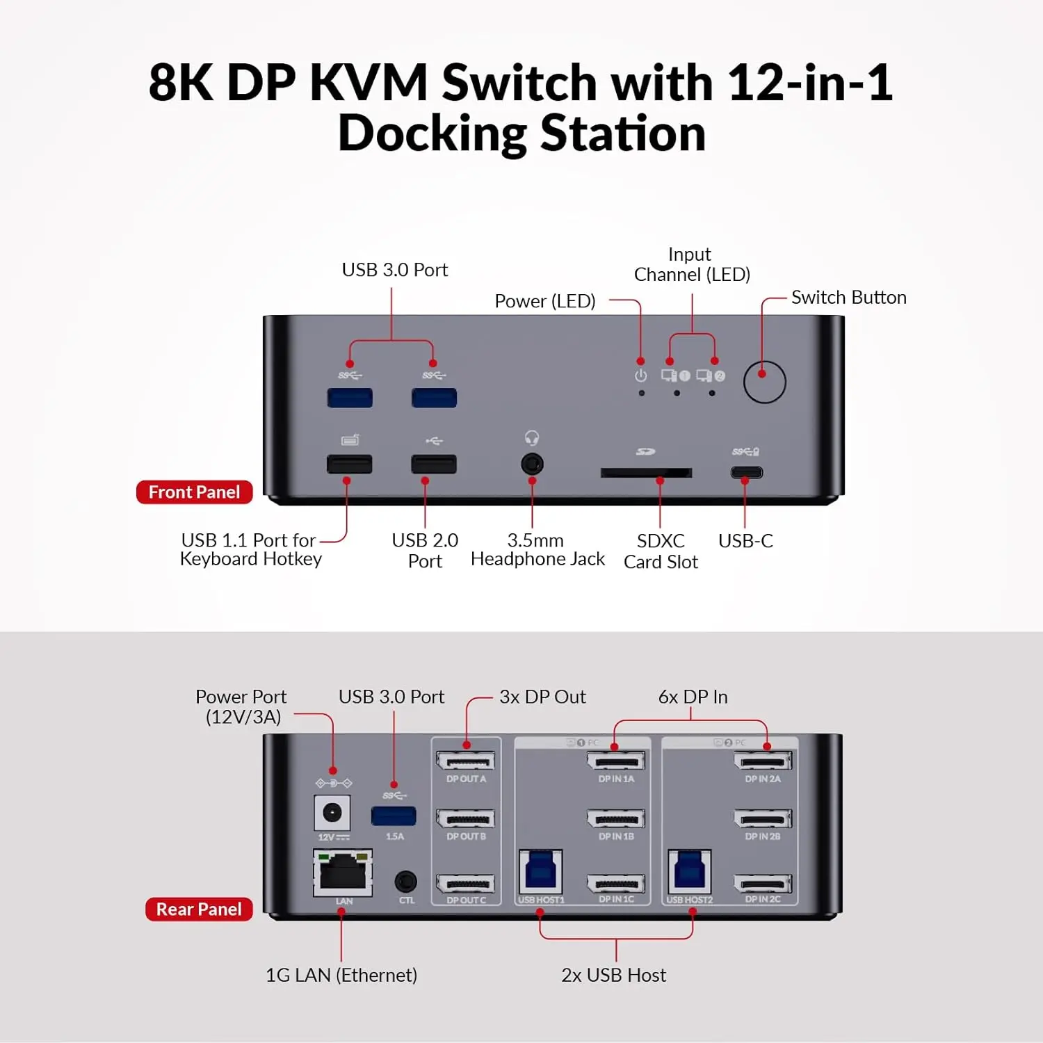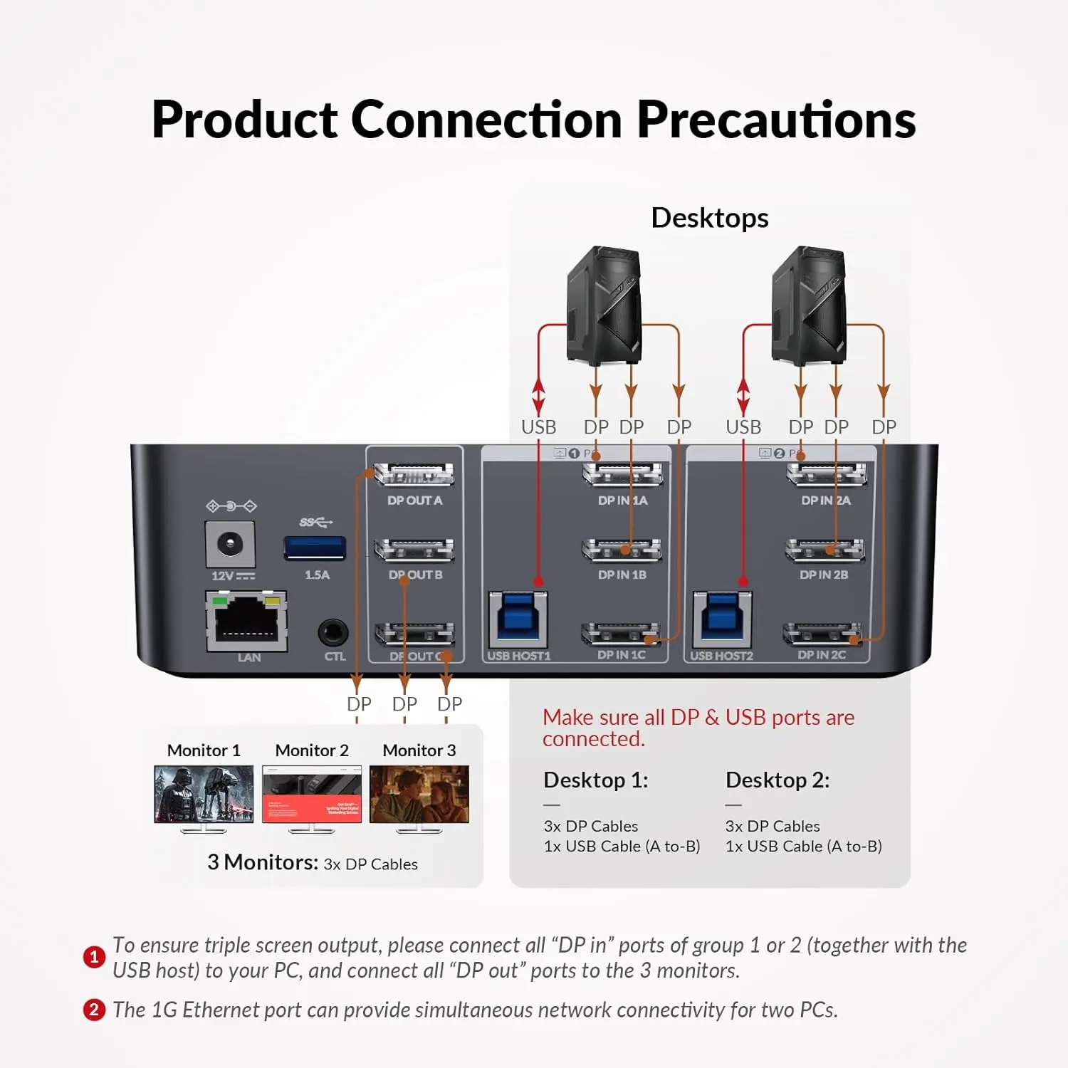 ·Built with 6x DisplayPort input ports (MST, 3 in 1 group) and 3x DisplayPort output ports. Switch between workstations and gaming desktops. View 3 monitor screens simultaneously. 📺