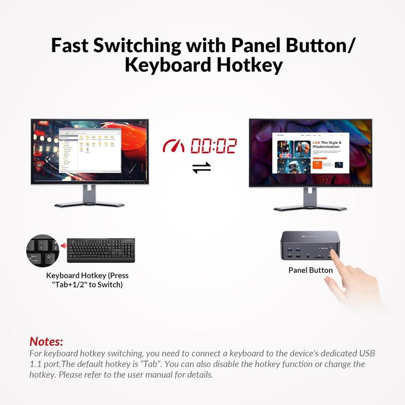 ·Automatic PC wake-up function. Switch between PC sources in 2-3 seconds. Use the front control button, wired remote controller, or keyboard hotkey. 📺