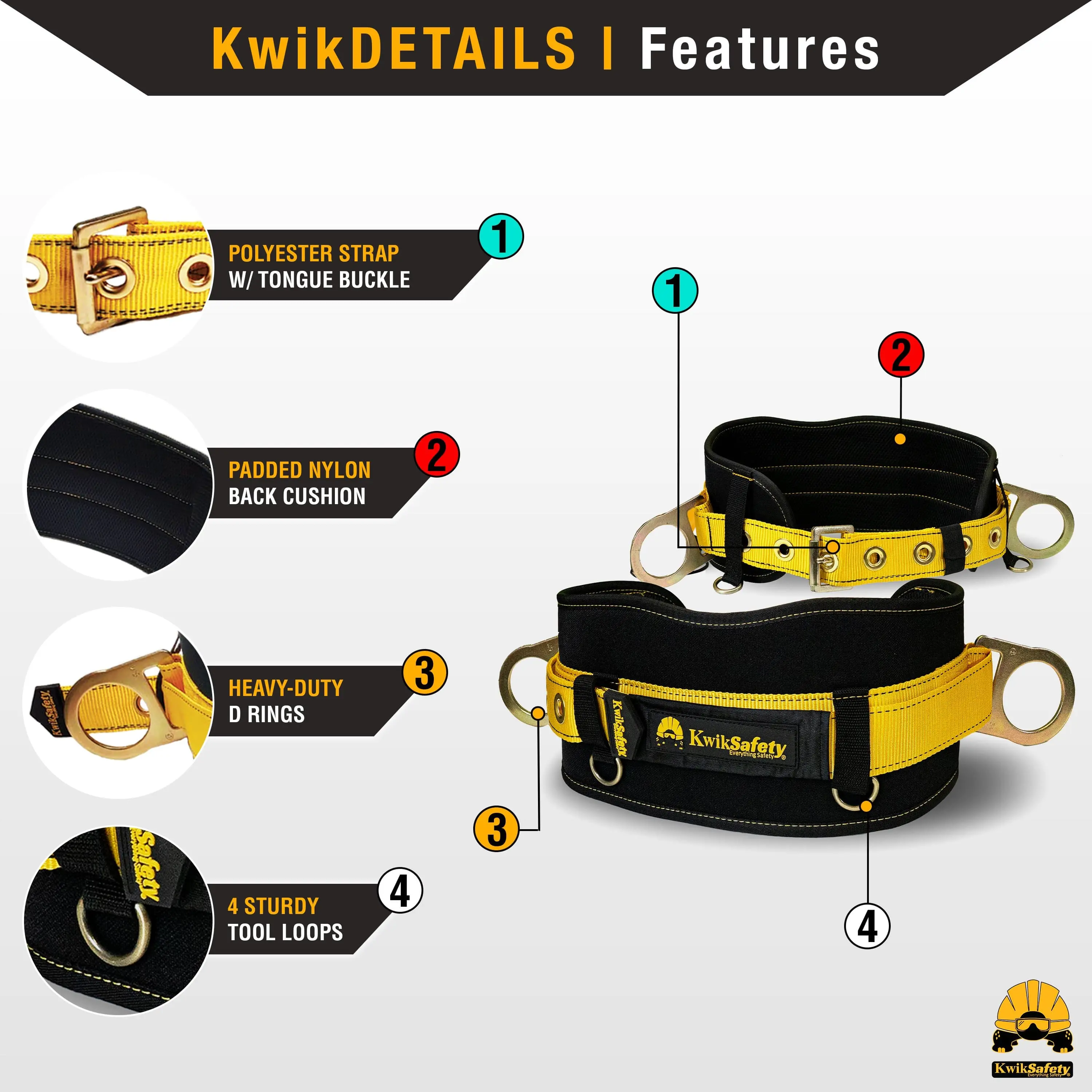 ·Heavy-Duty Construction: Equipped with 2 heavy-duty yellow zinc anodized side d-rings, this belt is perfect for positioning and other specific locations, such as rebar tying, tower maintenance, tree cutting, and more.