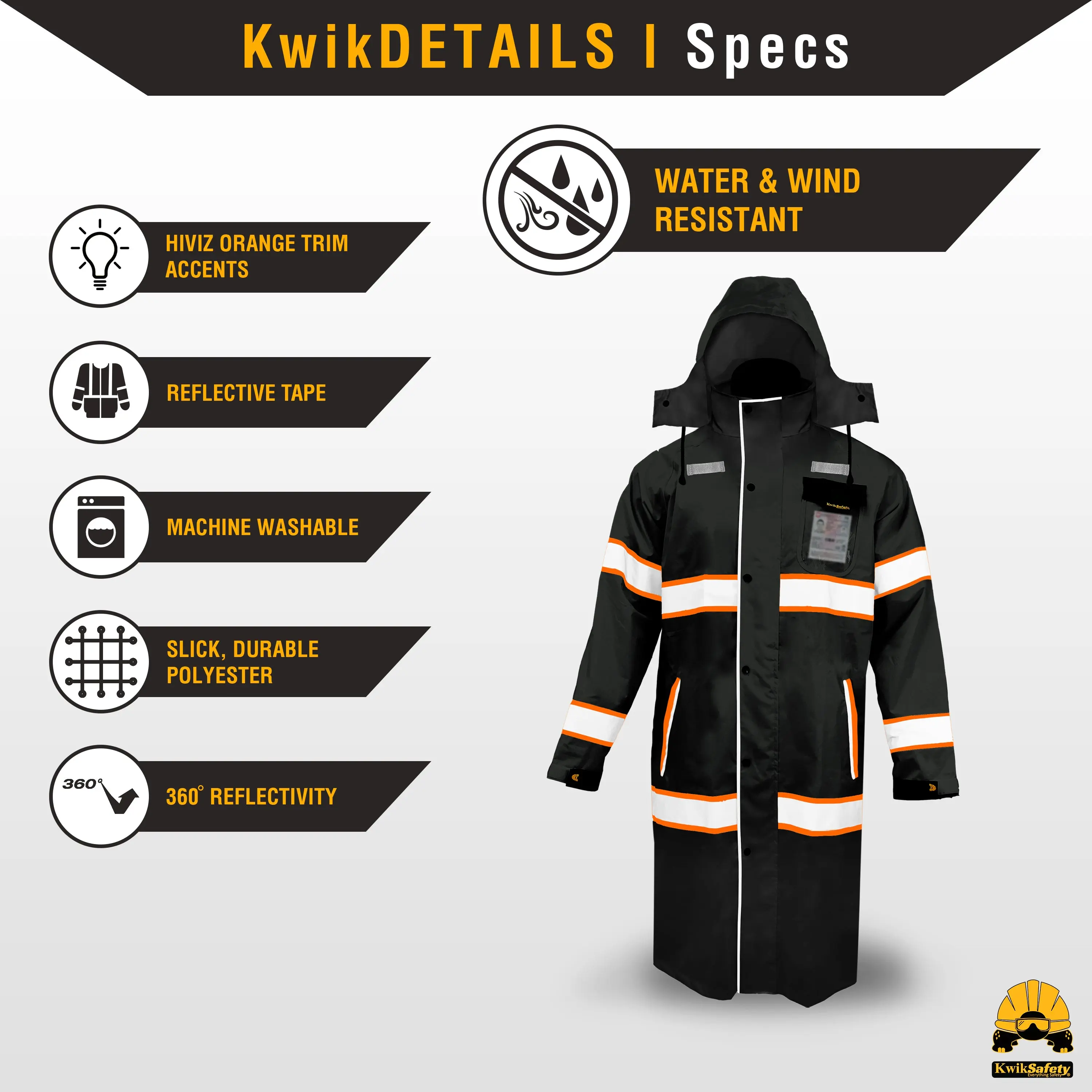 Introducing the KwikSafety Torrent High Visibility Rain Gear, model number KS5506BLK. This premium black rain jacket is designed for high visibility and durability, making it an essential piece of hi vis gear for various professionals.