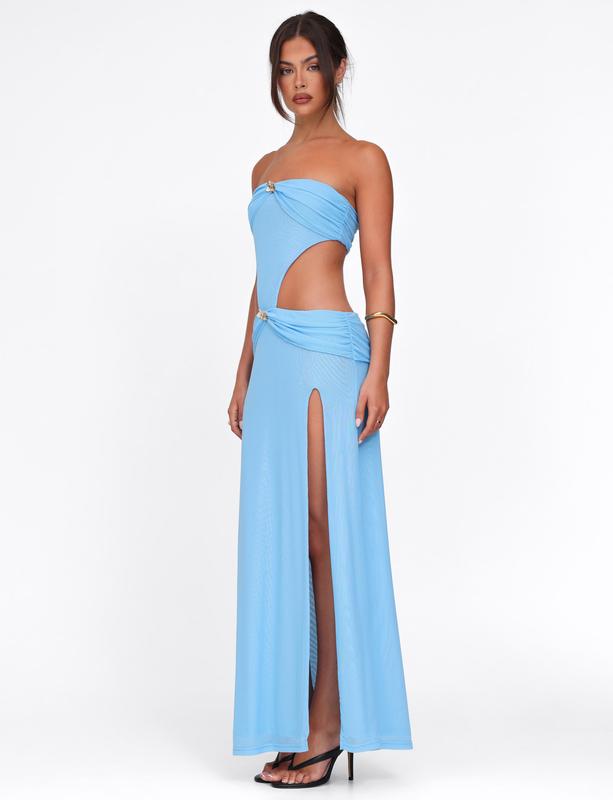 Blue cut-out dress in mesh fabrication Maxi length and fitted silhouette Strapless neckline Band style top featuring floral gold metal hardware Ruching detailing at bust center and side seams