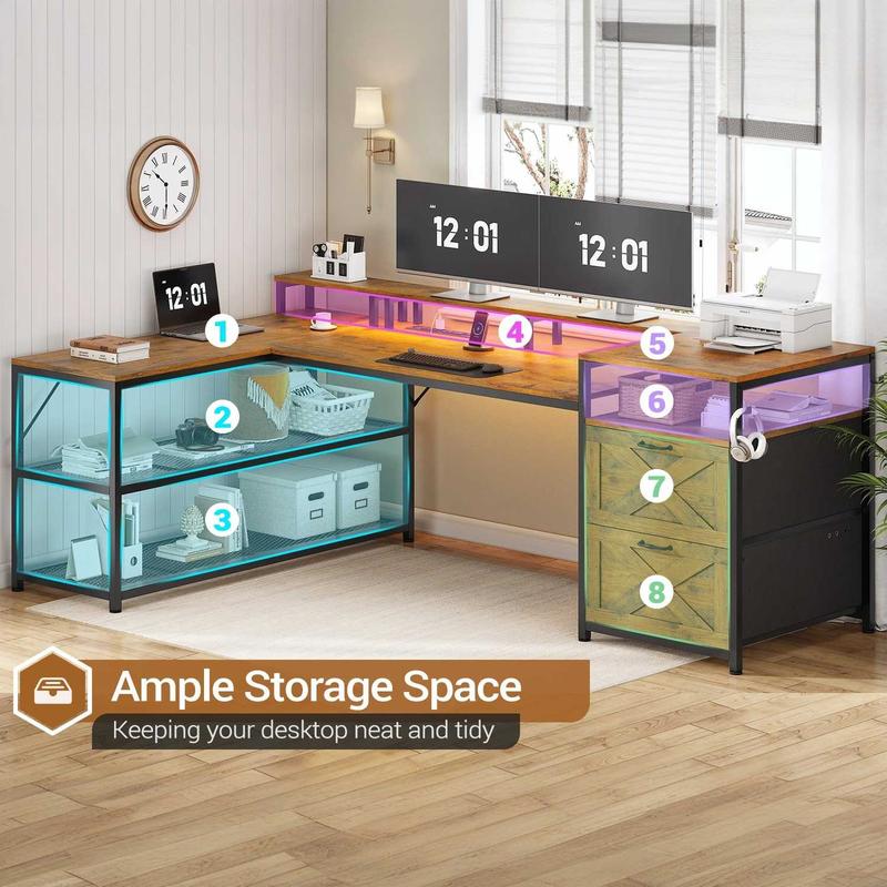 【Reversible Desk with Storage】Reversible 67-inch corner desk -- You can try two installation methods (left or right). L shaped desk is perfect for tucking into a corner, it can hold your computer, monitor, files, and books for the home office. The 2 file drawers for legal/letter/A4 can be placed left or right for your needs. The 3 adjustable long storage shelves of the desk offer ample storage space for books, documents, and other supplies.