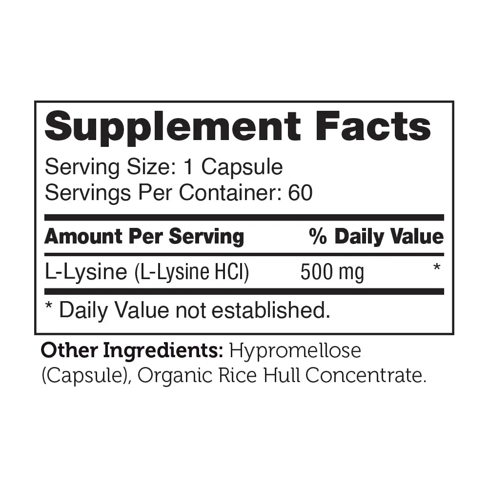 Each bottle contains 60 capsules, offering a full month's supply. These easy-to-swallow capsules simplify integrating L-Lysine into your daily routine. Manufactured in the USA in a GMP-certified facility, ensuring rigorous quality standards and optimal potency.
