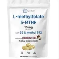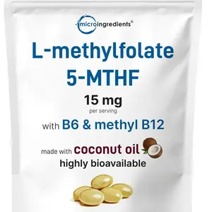 ·Micro Ingredients offers a highly bioavailable 3-in-1 L-Methylfolate softgel formula made with coconut oil for enhanced absorption, delivering active folate as 5-MTHF (25mg DFE containing 15mg L-Methylfolate) per serving with Vitamin B6 and Methyl B12.