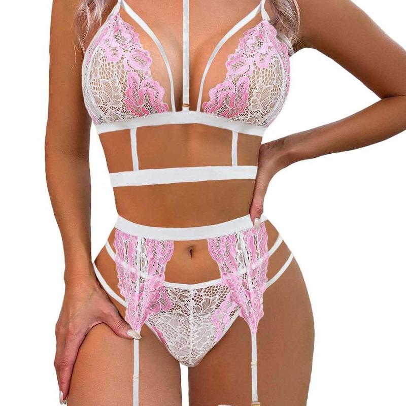 Design: Women lace bralette bra and panty set v-neck lingerie set features a delicate lace fabric, a strappy bra with removabel choker, a g-string thong , a suspender belt.This set is perfect for showing off your killer body