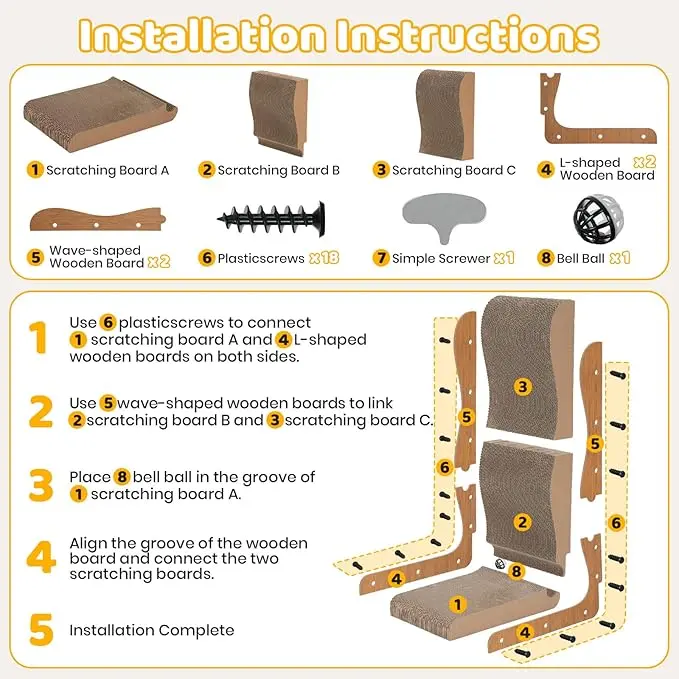 ·Easy to Assemble: Our L-shaped cat scratch pad requires assembly, you can watch the installation video on the product page to make setup even faster. We’ve also included longer screws than most brands for a more secure connection