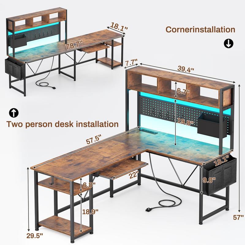 【Reversible Desk】 57.5 inch l shaped desk or 78.7 inch long office desk. The l Shaped desk is perfect for tucking into a corner, it can hold your computer, monitor, keyboard, files, books or CPU stand for home office. Or 78.7 inch two person desk can hold two-person studying or writing no interference. And the top hutch can place left or right according to your needs.