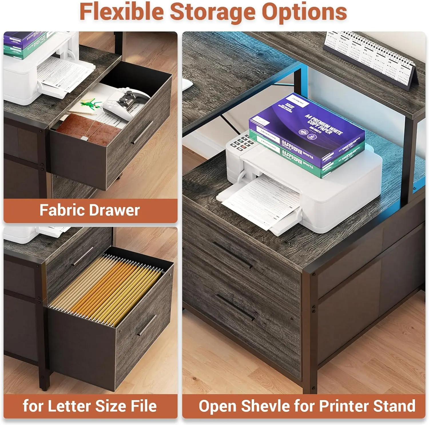 Create a versatile workstation that’ll meet all your needs, this office desk with large computer desktop, 2 drawers, 2 tier under storage shelves, printer cabinet, computer tower stand, power outlet and led light.