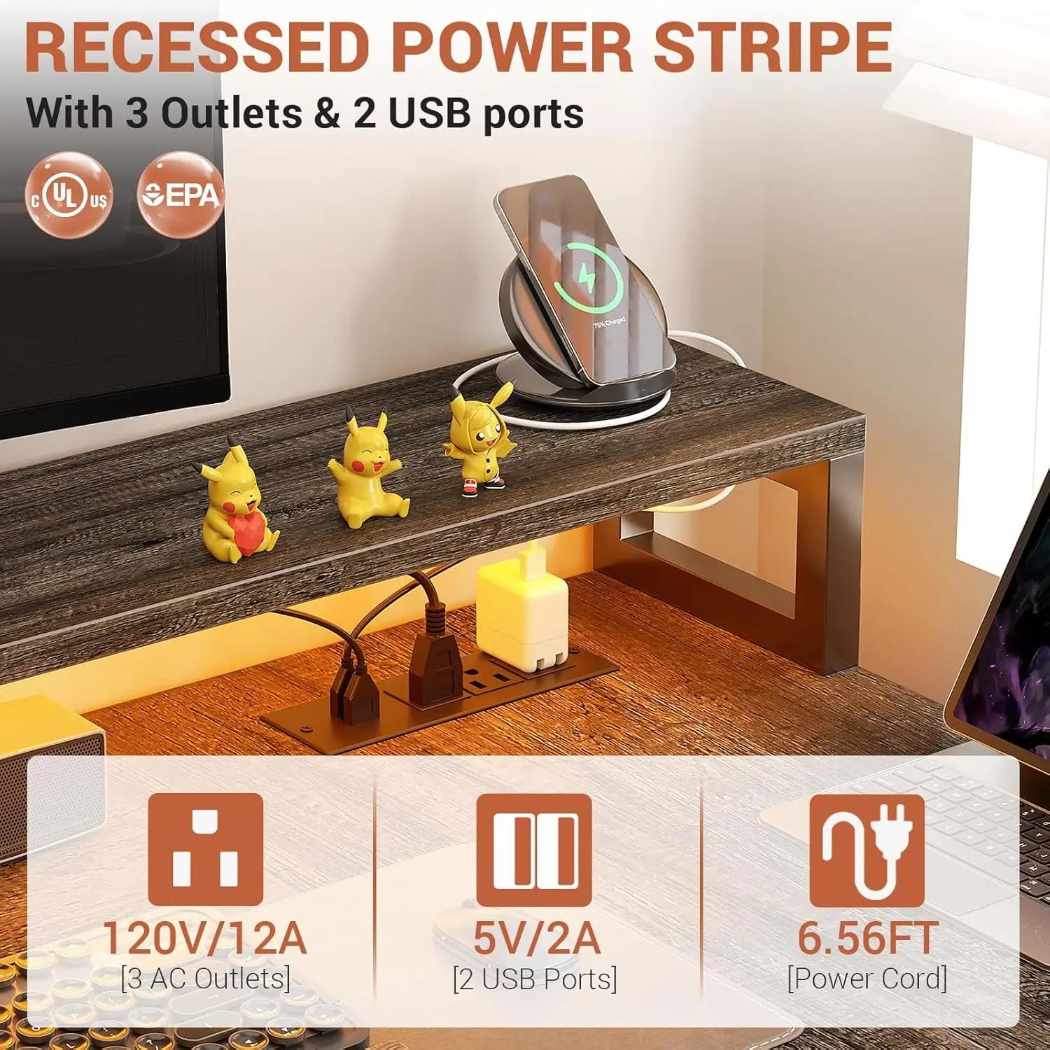 Our charging station includes 3-outlet & 2 USB ports to provide power for up to 5 devices.