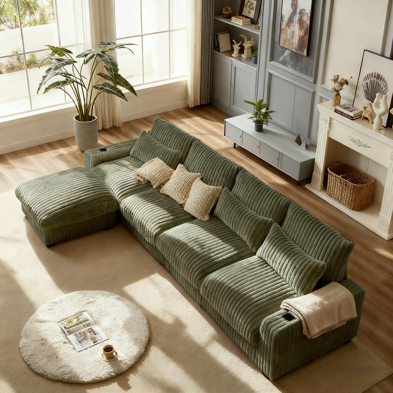 【3 packages delivery】Niccae L-Shaped Corduroy Sofa with USB Port & Cup Holder, Movable Footrest, 4 Back & Waist Pillows, Large Sectional for Living Room, Home Office & Apartment, Solid Wood Frame