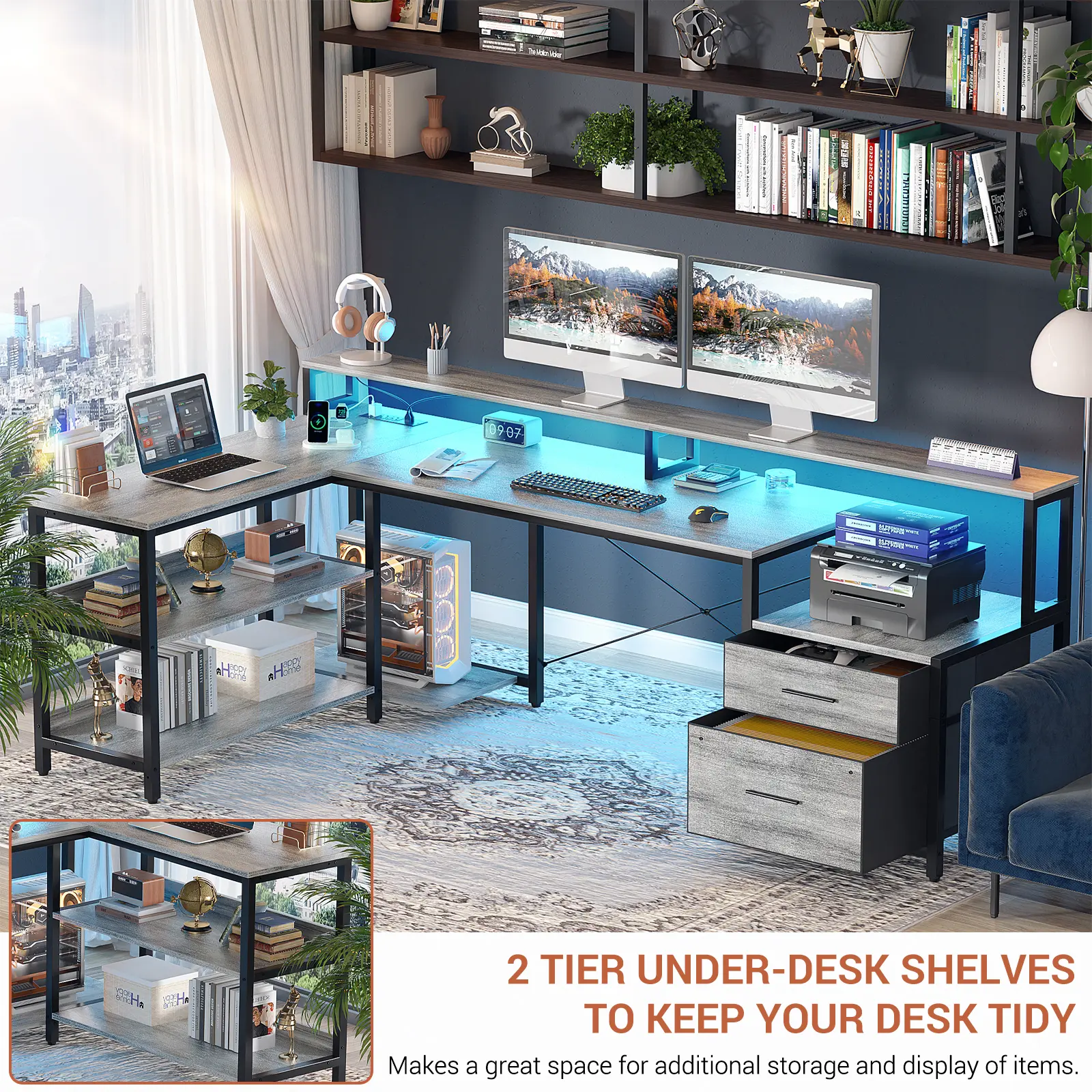 office desk with large computer desktop, 2 drawers, 2 tier under storage shelves, printer cabinet, computer tower stand, power outlet and led light.