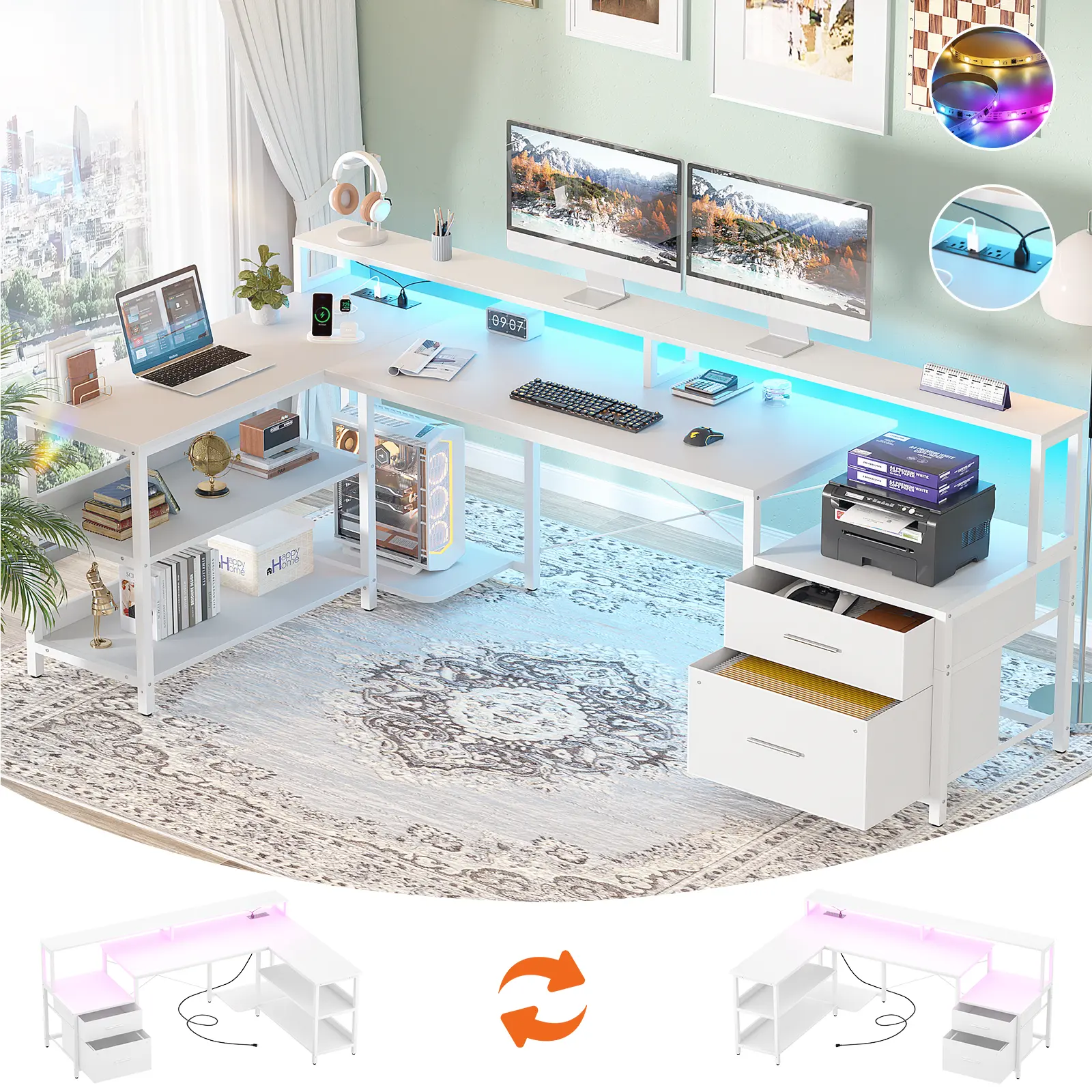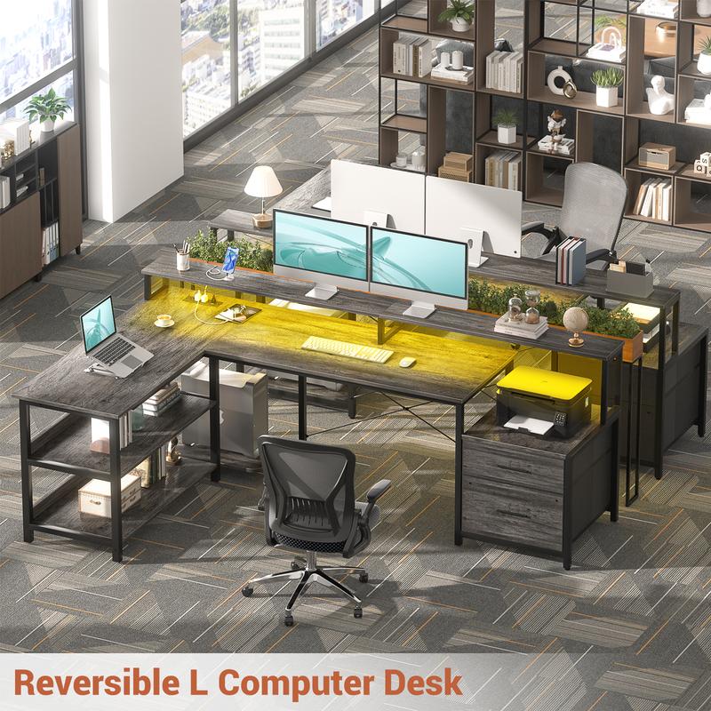 ·【Convertible Gaming Desk with Extra Large Desktop】The l shaped desk with drawers is with reversible design to suit your space perfectly. Whether it's for home office working, gaming, or studying, enjoy the freedom to set it up as a left or right-corner desk, adapting to your specific needs. The 66 inch corner desk with a large main desktop could hold two desktop computers and one notebook computer. Dimension: 66.8"L x 39.4"W x 34.8"H