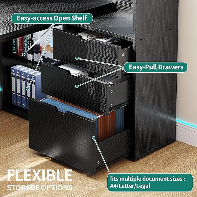 Ample Storage Space: 2-in-1 corner desk combines a computer desk with a file cabinets featuring 1 file drawer with adjustable hanging bars for letter, A4, legal size files, 2 drawers for small office supplies, and 2 bottom open storage shelves with 3-heights adjustable for different heights item. Also, the spacious upper open shelf can be also used as printer stand holding printers, scanners, fax machines or any other office machines within your reach to improve working efficiency