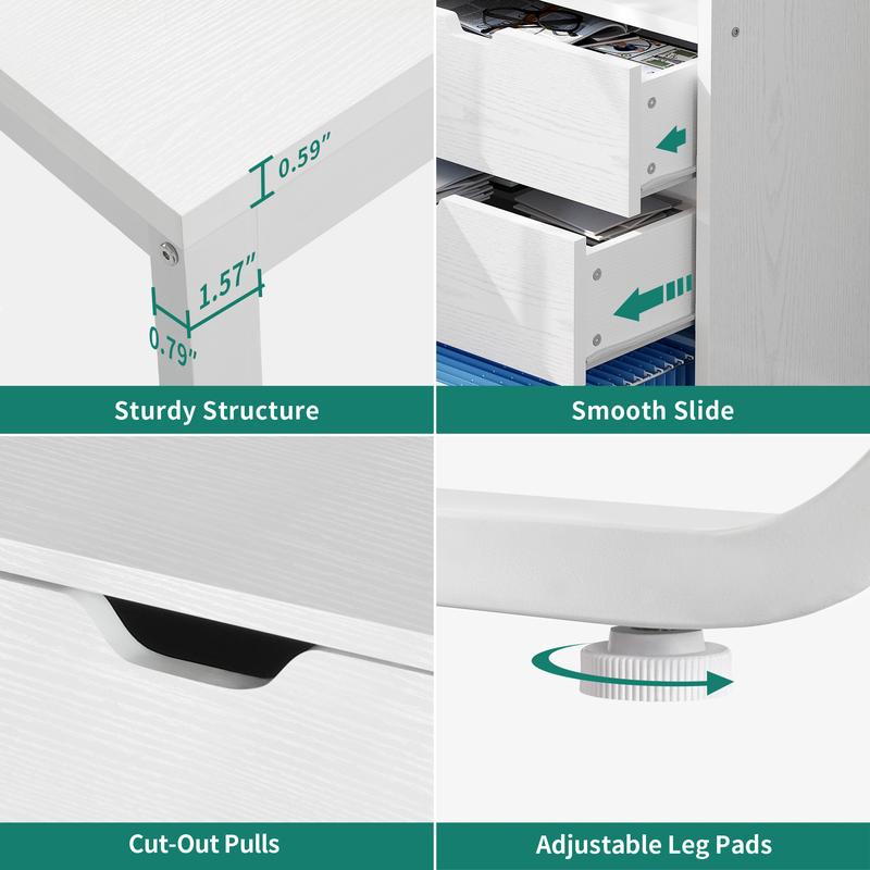 Ample Storage Space: 2-in-1 corner desk combines a computer desk with a file cabinets featuring 1 file drawer with adjustable hanging bars for letter, A4, legal size files, 2 drawers for small office supplies, and 2 bottom open storage shelves with 3-heights adjustable for different heights item. Also, the spacious upper open shelf can be also used as printer stand holding printers, scanners, fax machines or any other office machines within your reach to improve working efficiency