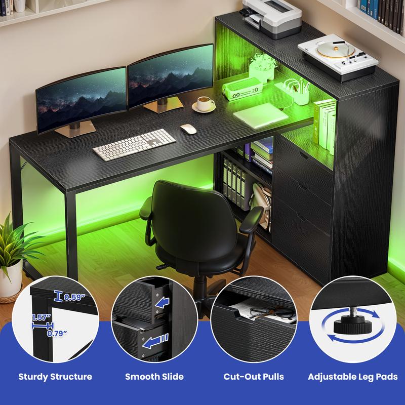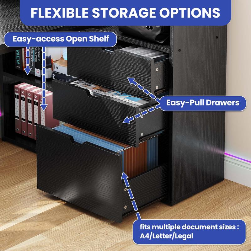 L Shaped Desk with Bookshelf: 2-in-1 corner desk combines office desk with bookshelf featuring 1 file drawer with adjustable hanging bars for letter, A4, legal size files, 2 drawers for small office supplies, and 2 bottom open storage shelves with 3-heights adjustable for different heights item. Also, the spacious upper open shelf can be also used as printer stand holding printers, scanners, fax machines or any other office machines within your reach to improve working efficiency