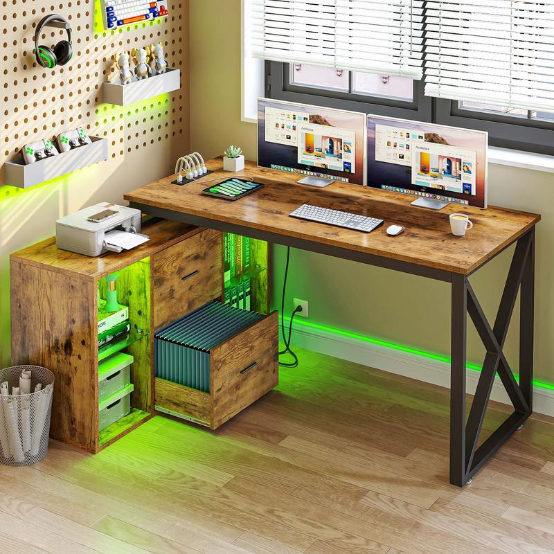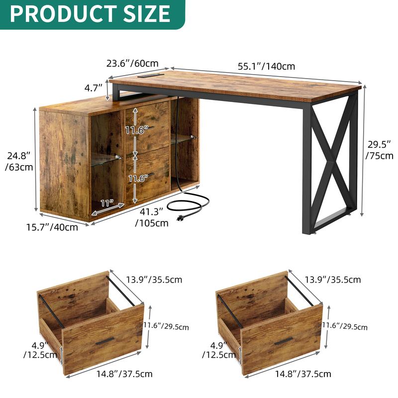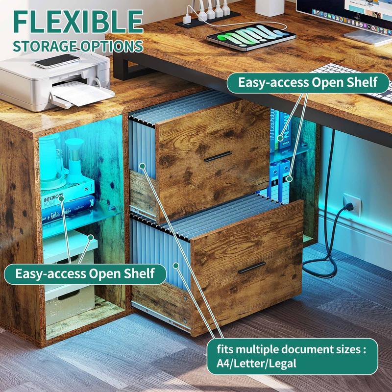 L Desk with File Cabinet: 2-in-1 corner desk combines a computer desk with a file cabinet featuring 2 file drawer with adjustable hanging bars for letter, A4, legal size documents and 4 glass open shelves with 3-heights adjustable for different heights item. Also, the spacious top can be also used as printer stand