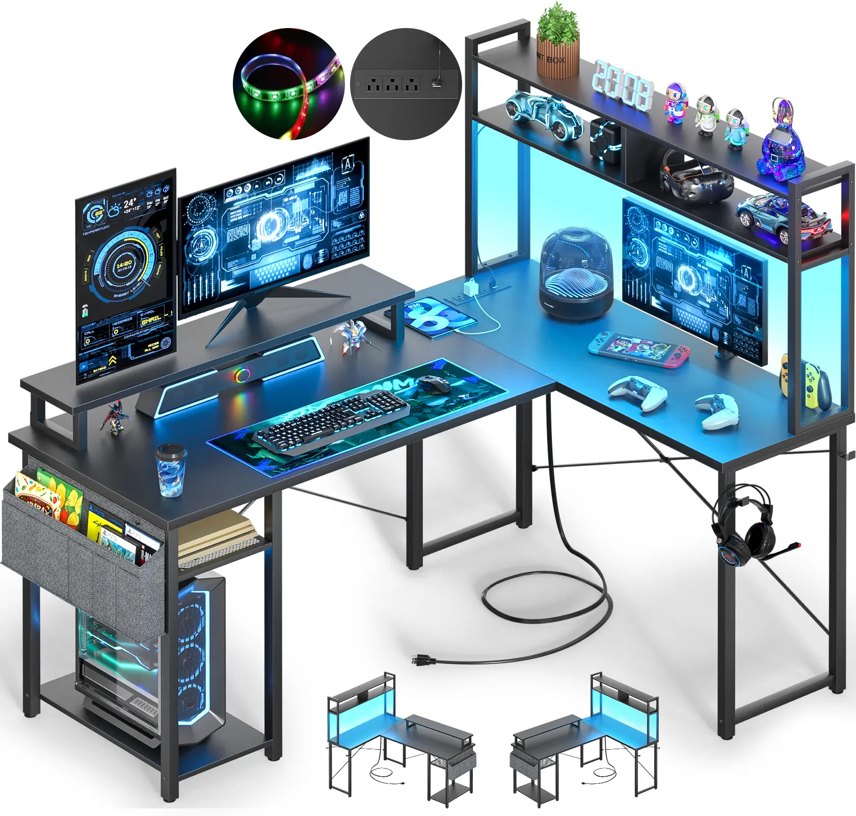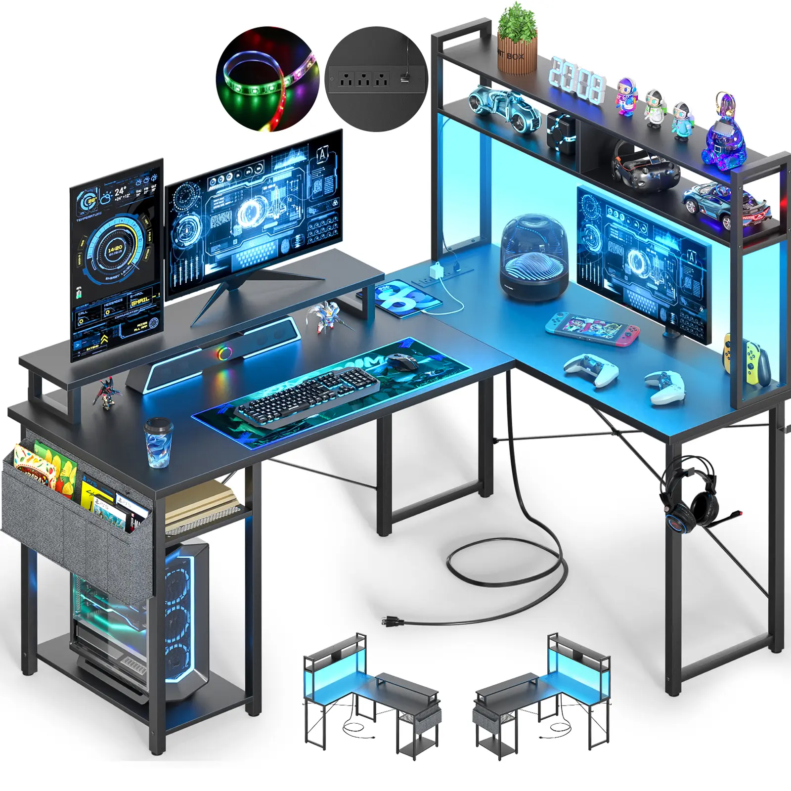 Our modern gaming desk perfect for small spaces, it comes with power outlet, led light, 2-tier tower shelf, a storage bag, monitor stand, CPU stand and 2 headphone hooks.